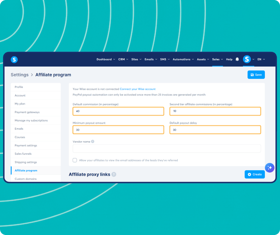 Define your default commission percentage and incentivize growth with second-tier rewards for sub-affiliates. Prevent small invoices by setting a minimum payout amount and manage refund risks by choosing a custom payout delay that aligns with your terms