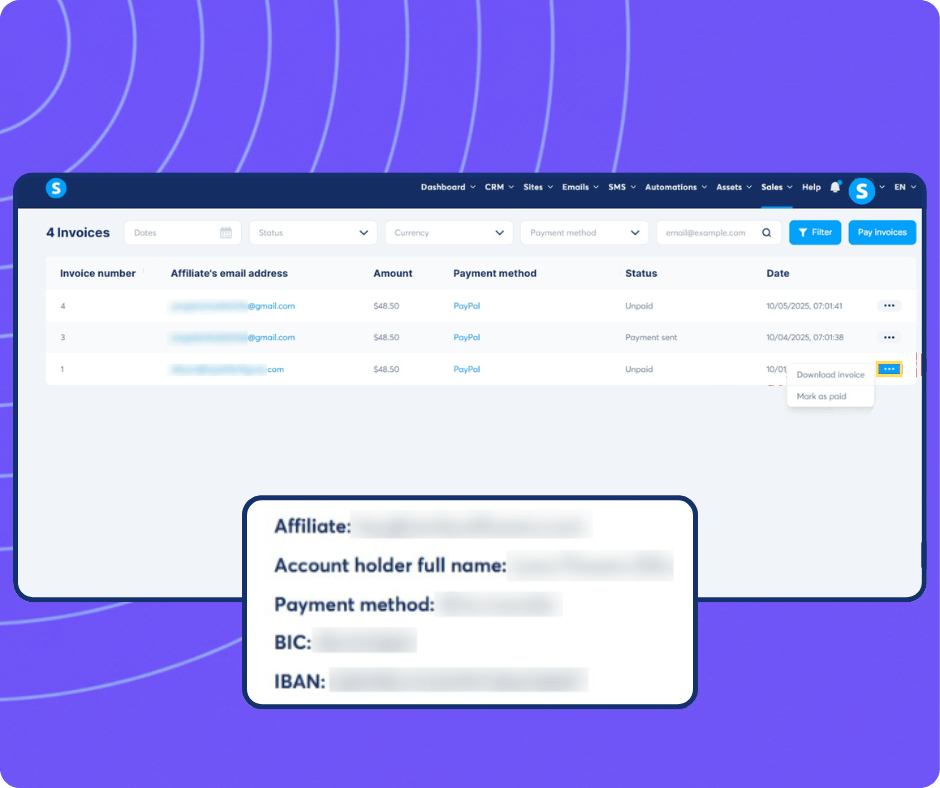 On the 10th of every month, the system automatically generates invoices for your affiliates. Your partners enter their preferred payment method (PayPal or wire) directly in their dashboard