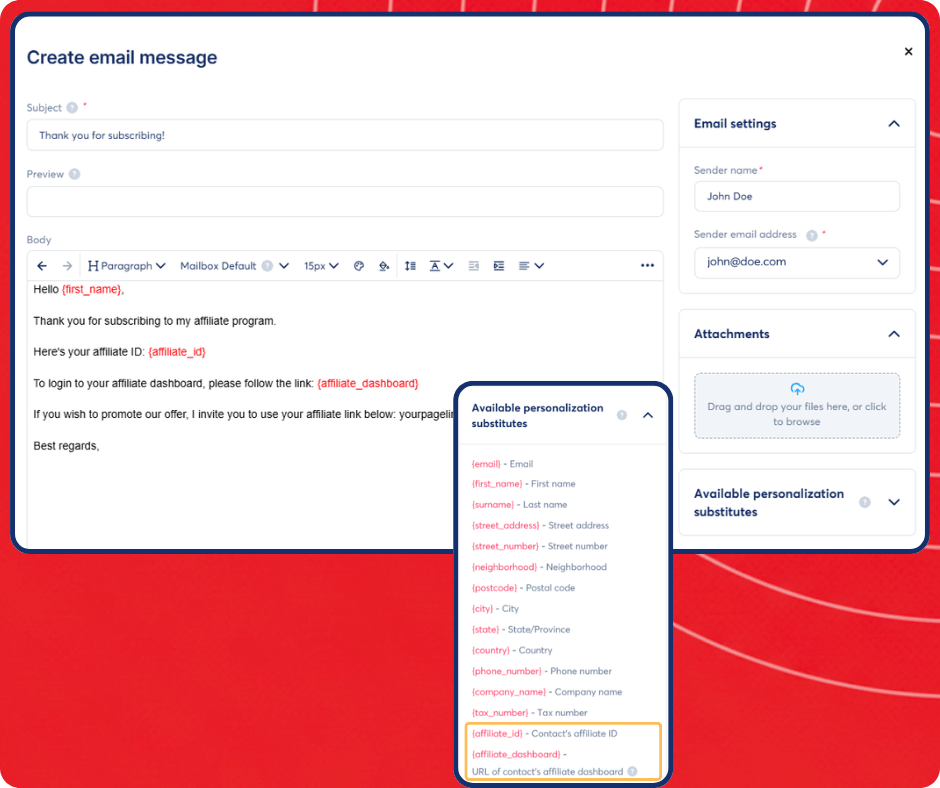 Automatically send a unique affiliate link to every subscriber using the {affiliate_id} variable in your emails