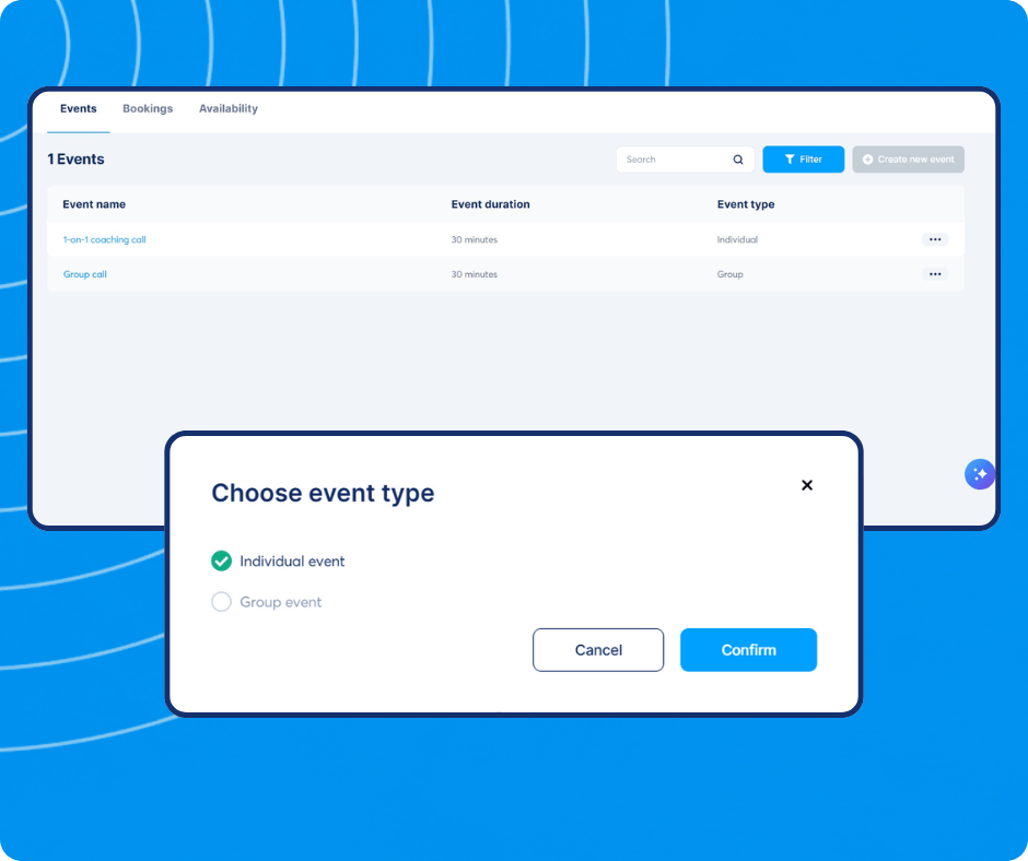 Whether you need to schedule 1-on-1 coaching sessions or group workshops with multiple attendees, simply select your event type and let the system handle the capacity limits