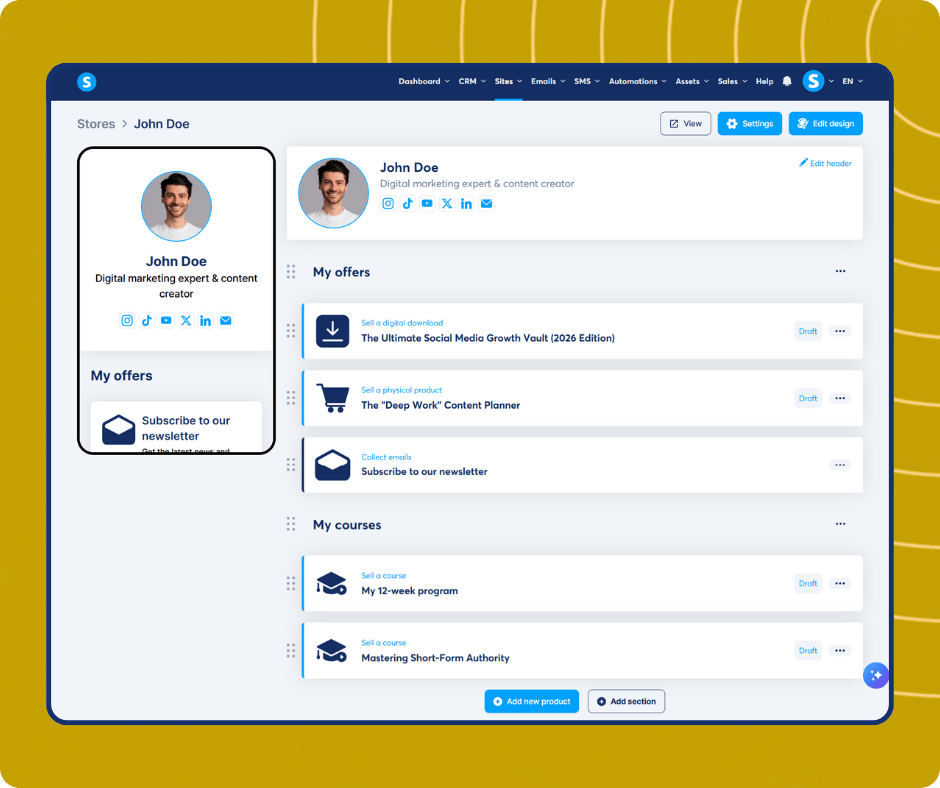 One store, endless possibilities. Add digital downloads, online courses, physical products, or even affiliate links to external sites, all arranged in a clean, easy-to-browse layout