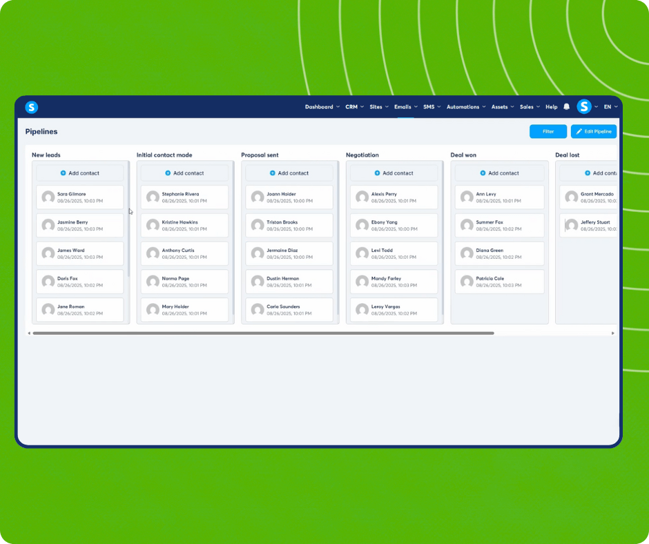 Get a bird's-eye view of your business. See exactly where every lead is in your dashboard, from "New Lead" to "Deal Won", and drag and drop them to the next stage instantly