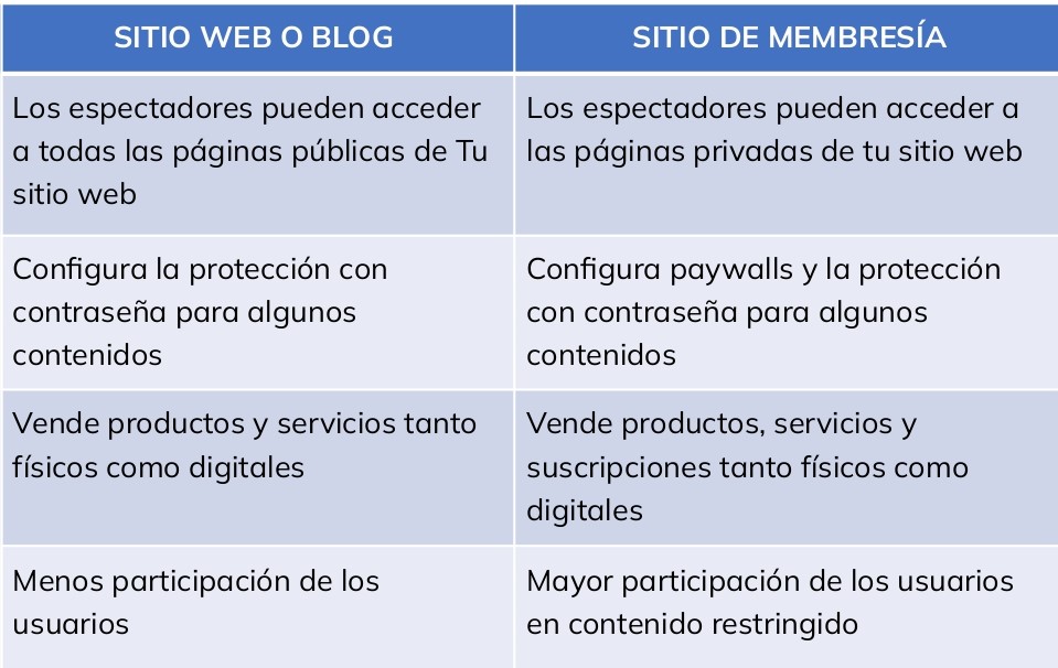 Aquí hay una tabla que compara WordPress con los sitios de membresía: