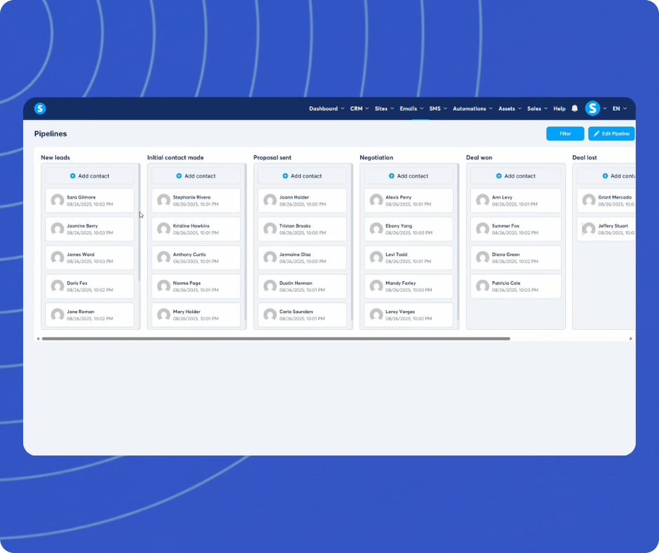 Track every lead’s journey from your dashboard. Visualize your sales process and automate follow-ups to close deals faster