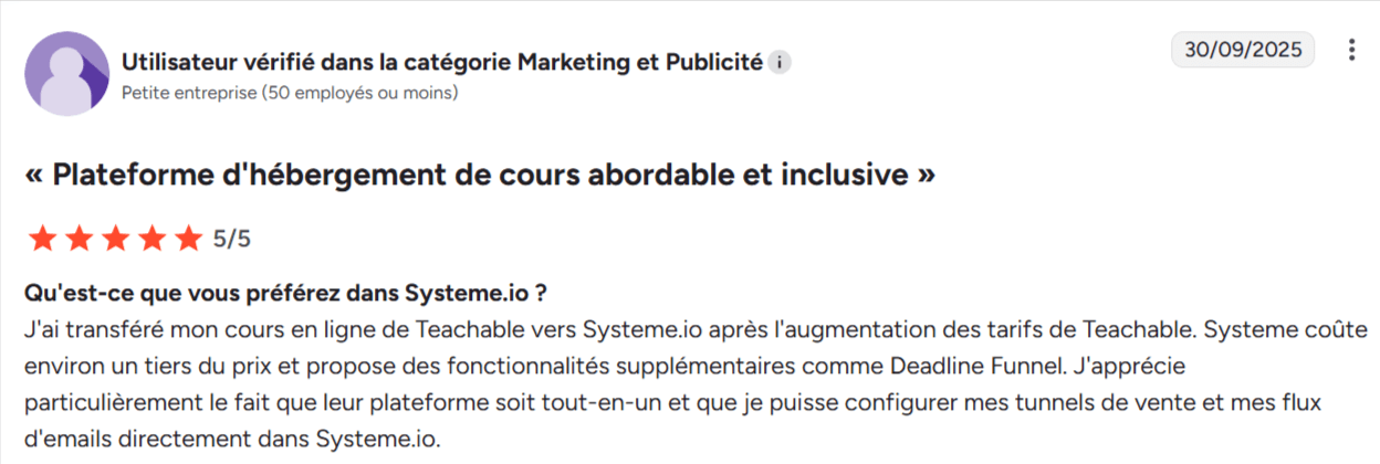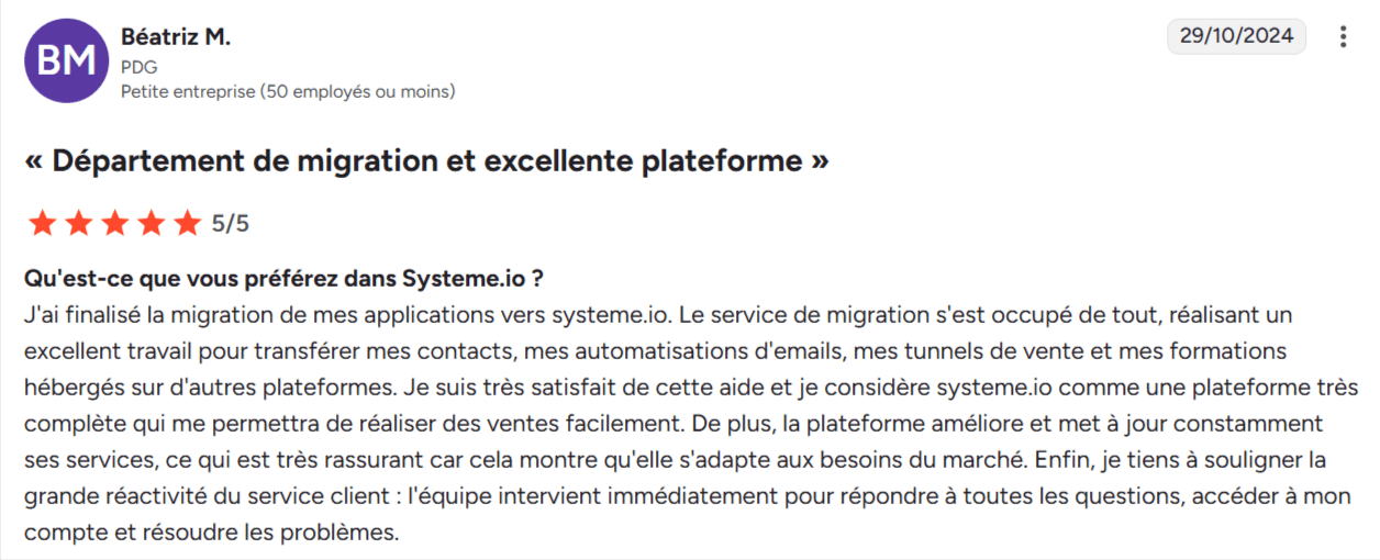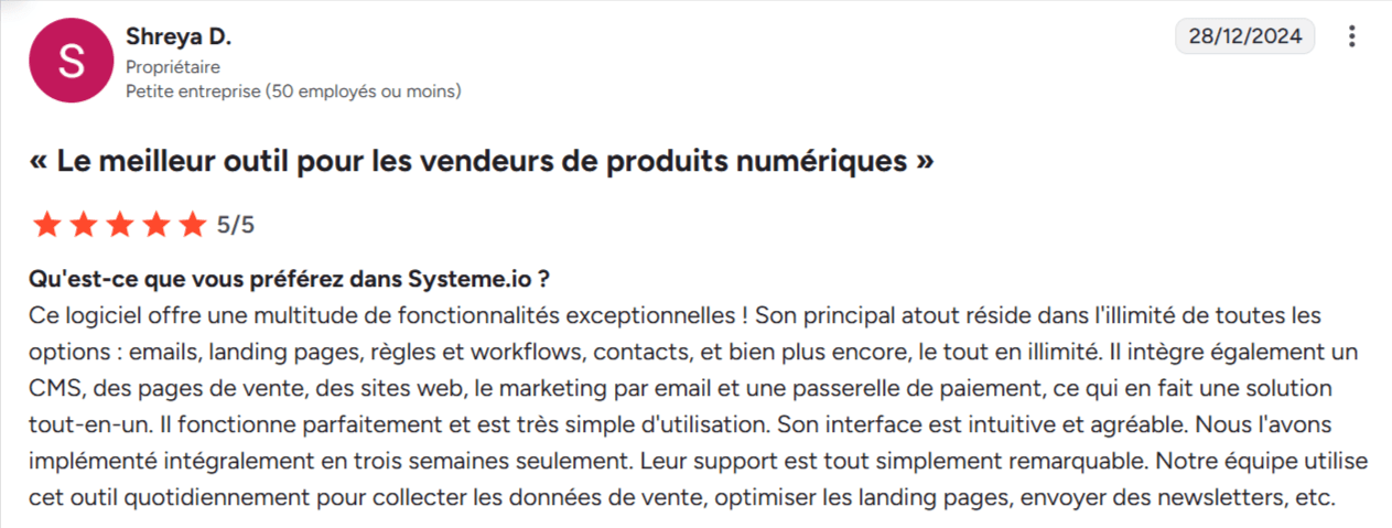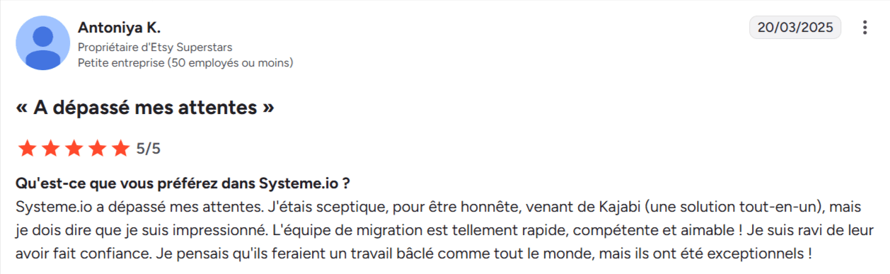 "Avant, je me compliquais beaucoup la vie (par ignorance) en ayant un site web d'un côté, marketing par email de l'autre, et en essayant d'intégrer le créateur de formation d'un tiers... Je suis vraiment heureuse de grandir avec systeme.io, merci de rendre la gestion de mon entreprise aussi simple que possible !"