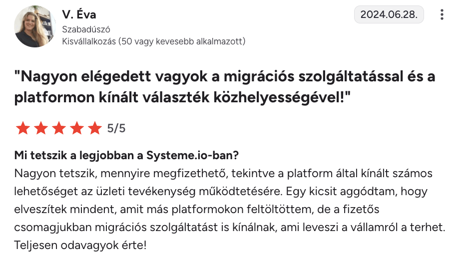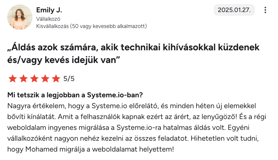 “Imádom, hogy a Systeme.io annyi funkciót kínál egyetlen platformon. Közel két éve használom nap mint nap, és semmi probléma nem adódott. Létrehoztam tölcséreket, e-mail automatizálást és egy blogot, amit máshol nem tudtam volna megvalósítani. A funkciók szuperkönnyen használhatók, és az ügyfélszolgálat is fantasztikus.”