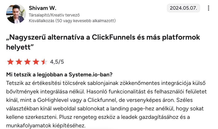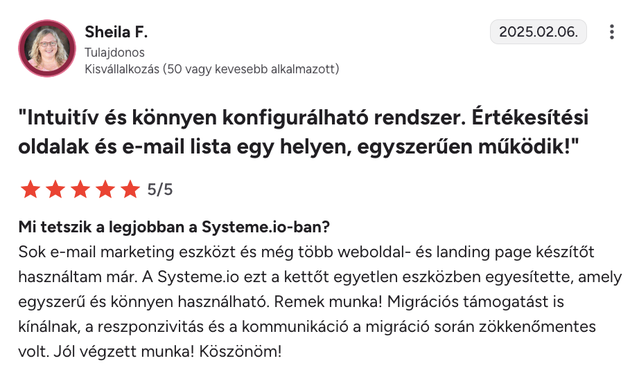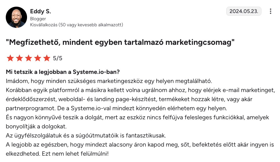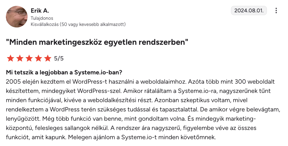 “Korábban a BuilderAll-t, ClickFunnelst és sok más platformot használtam. A Systeme.io messze a legegyszerűbb és a legjobb ár-érték arányú.”