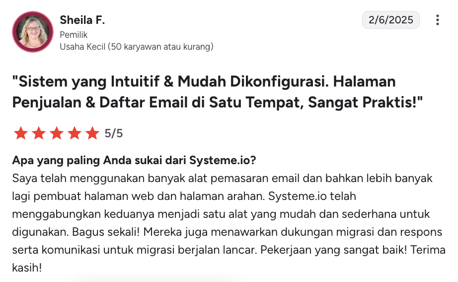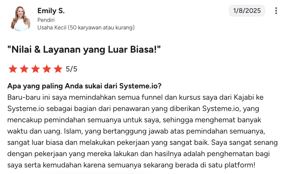 “Saya suka fakta bahwa Systeme.io menawarkan begitu banyak fitur dalam satu platform. Saya telah menggunakannya setiap hari selama hampir dua tahun tanpa masalah. Saya membuat funnel, otomasi email, dan blog, yang tidak bisa saya lakukan di tempat lain. Fitur-fiturnya sangat mudah digunakan, dan dukungan pelanggannya luar biasa.”