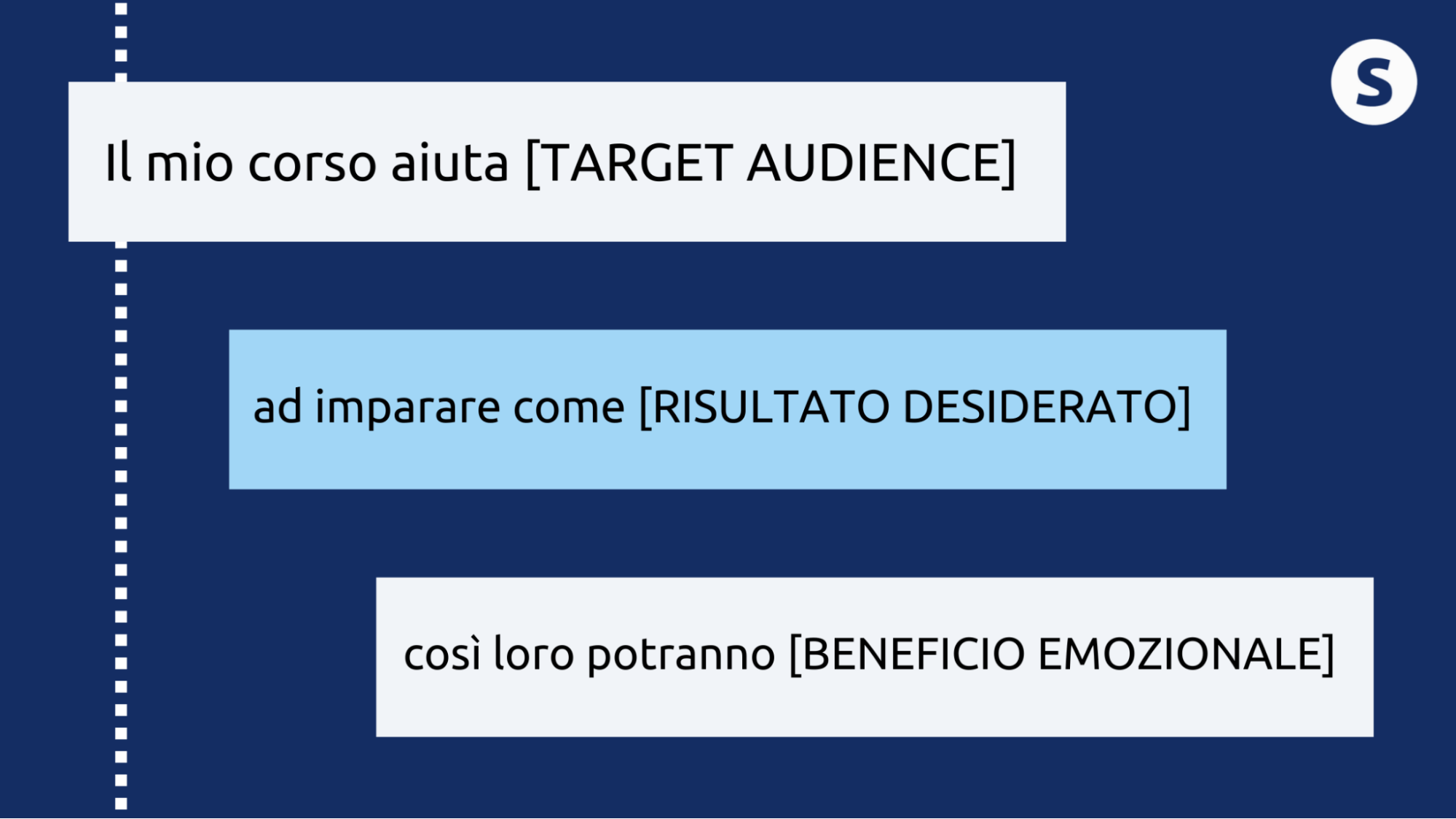 Ad esempio, se si sta creando un corso di formazione online sul marketing digitale, la singola frase dovrebbe essere così formulata: