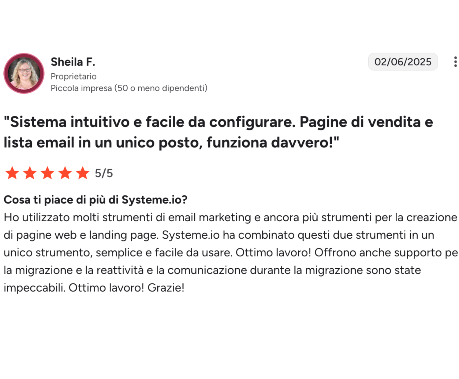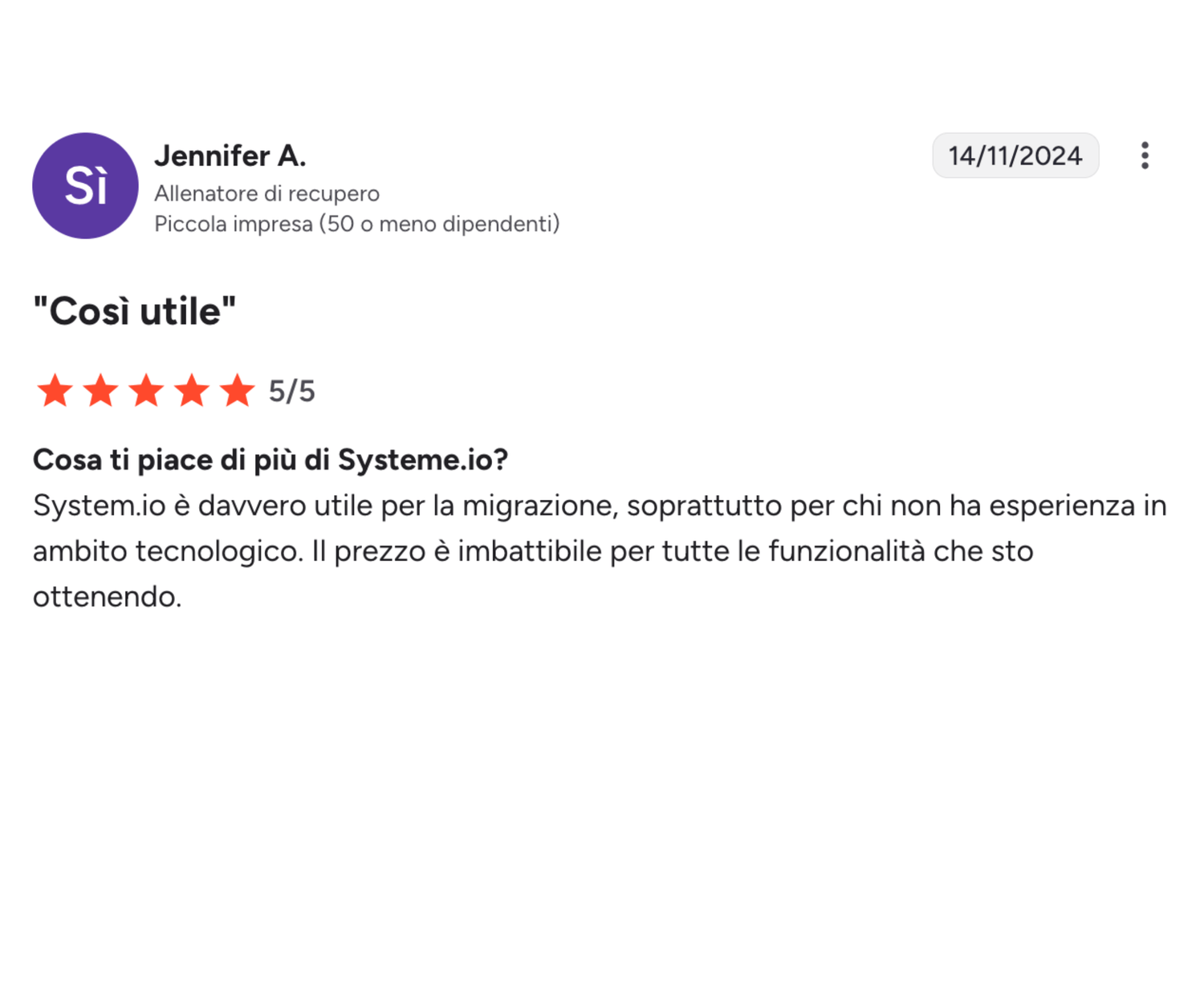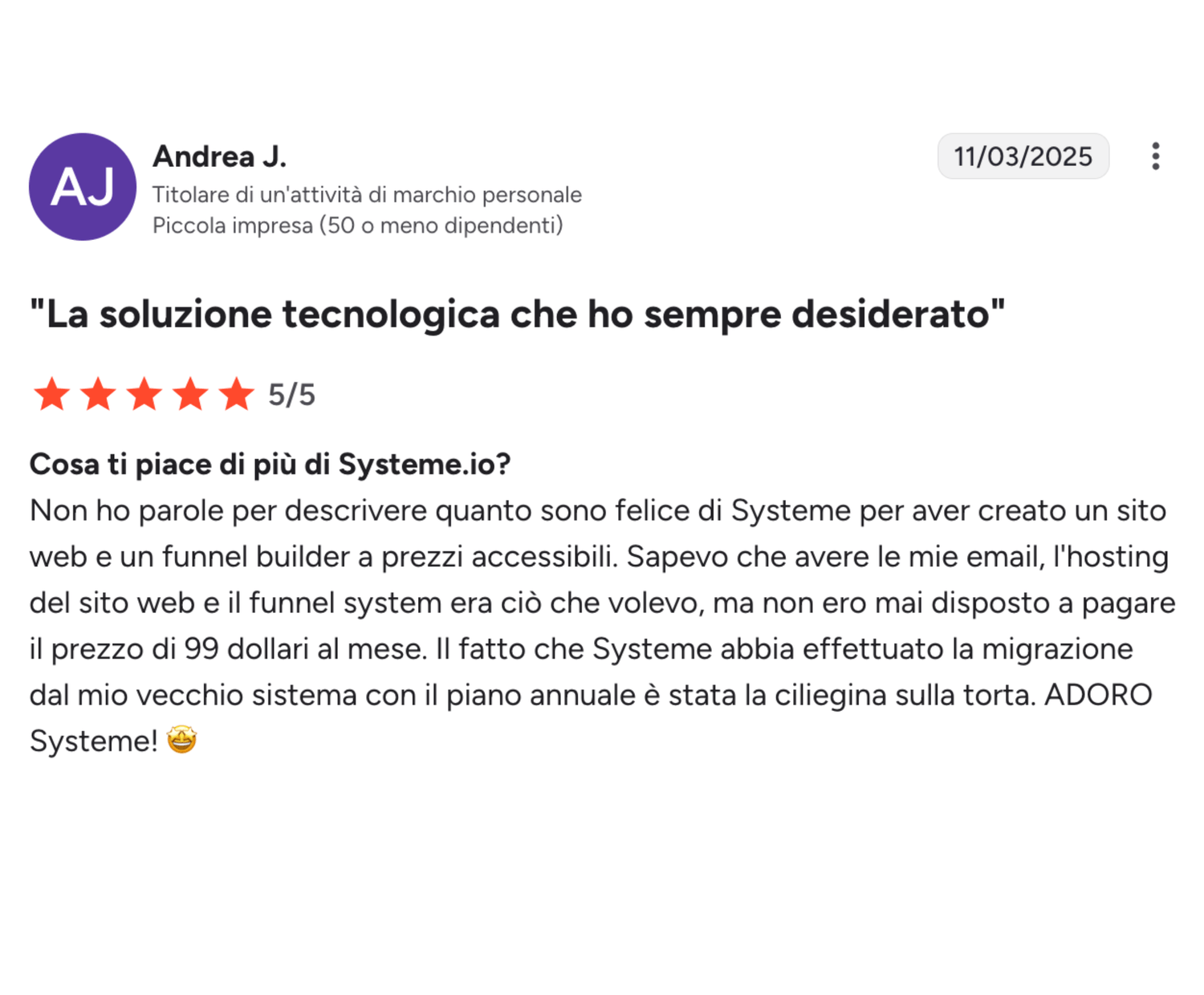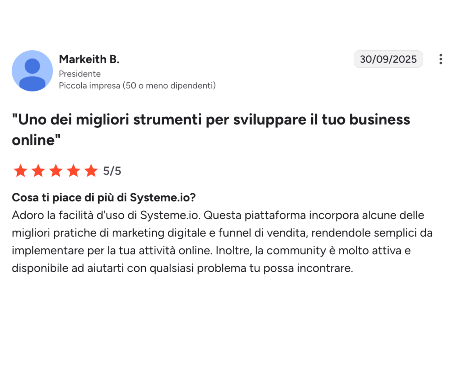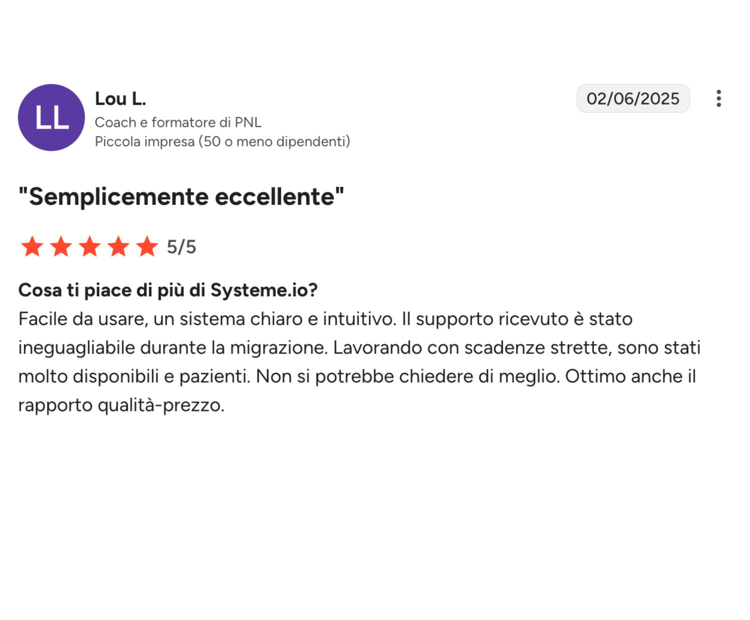 "In passato mi sono reso la vita molto più difficile (non sapendo come fare) avendo un sito web da una parte, un provider di email marketing dall'altra, cercando di integrare il costruttore di corsi con una terza parte... Sono davvero felice di crescere insieme a Systeme.io, grazie per aver reso la gestione