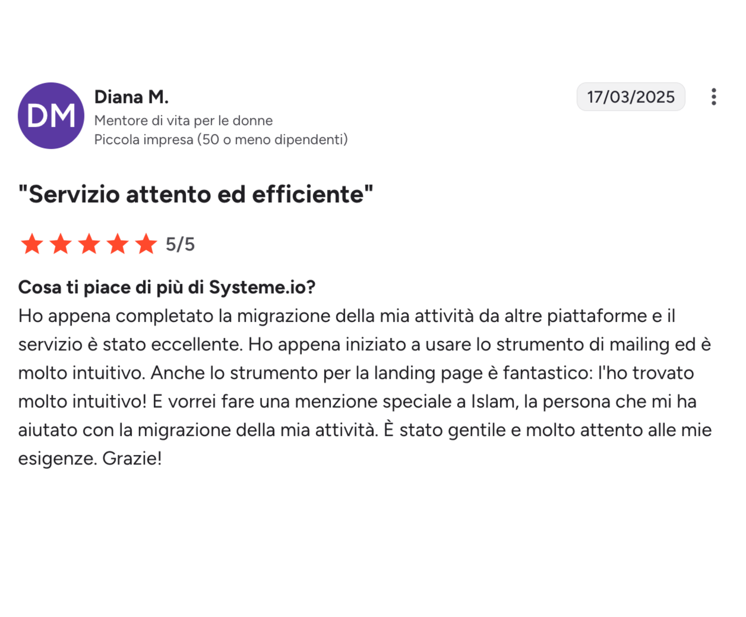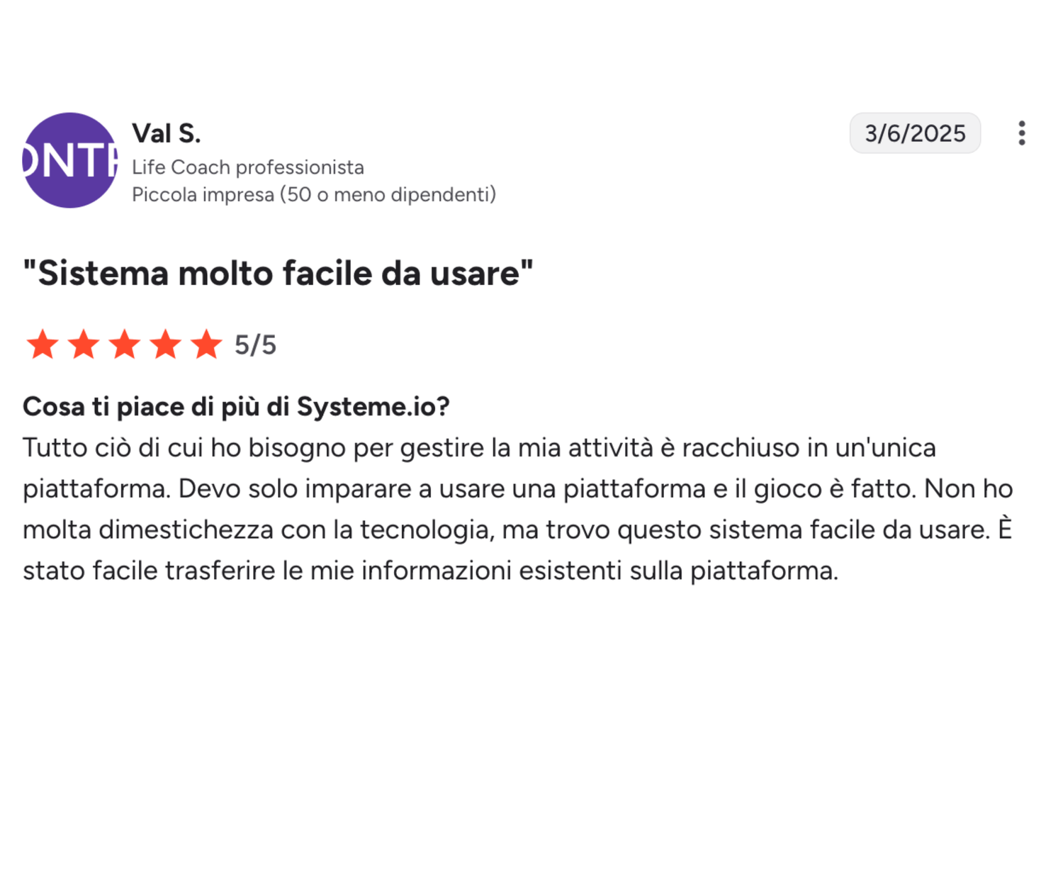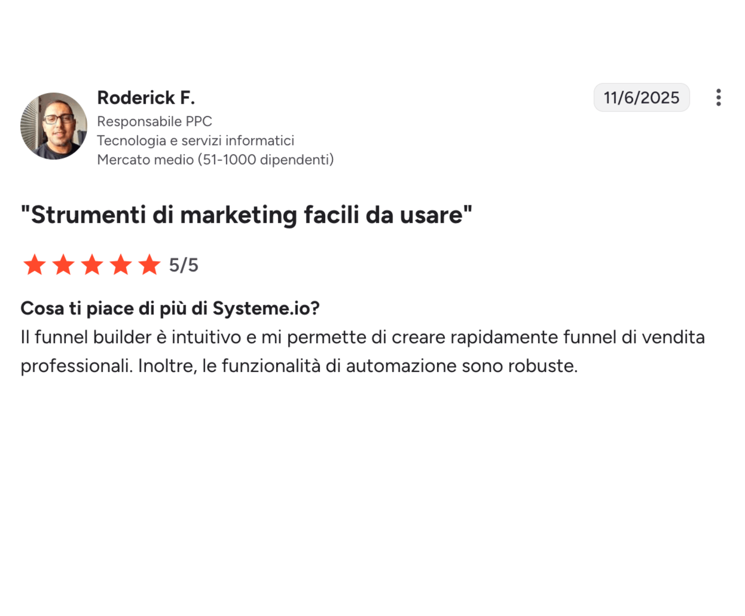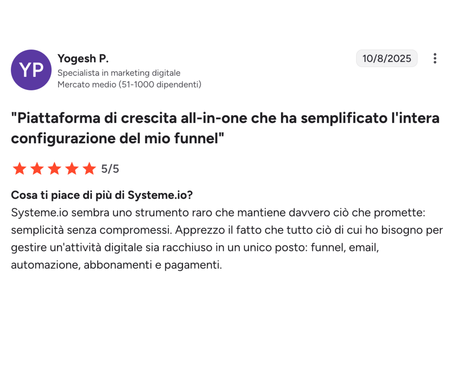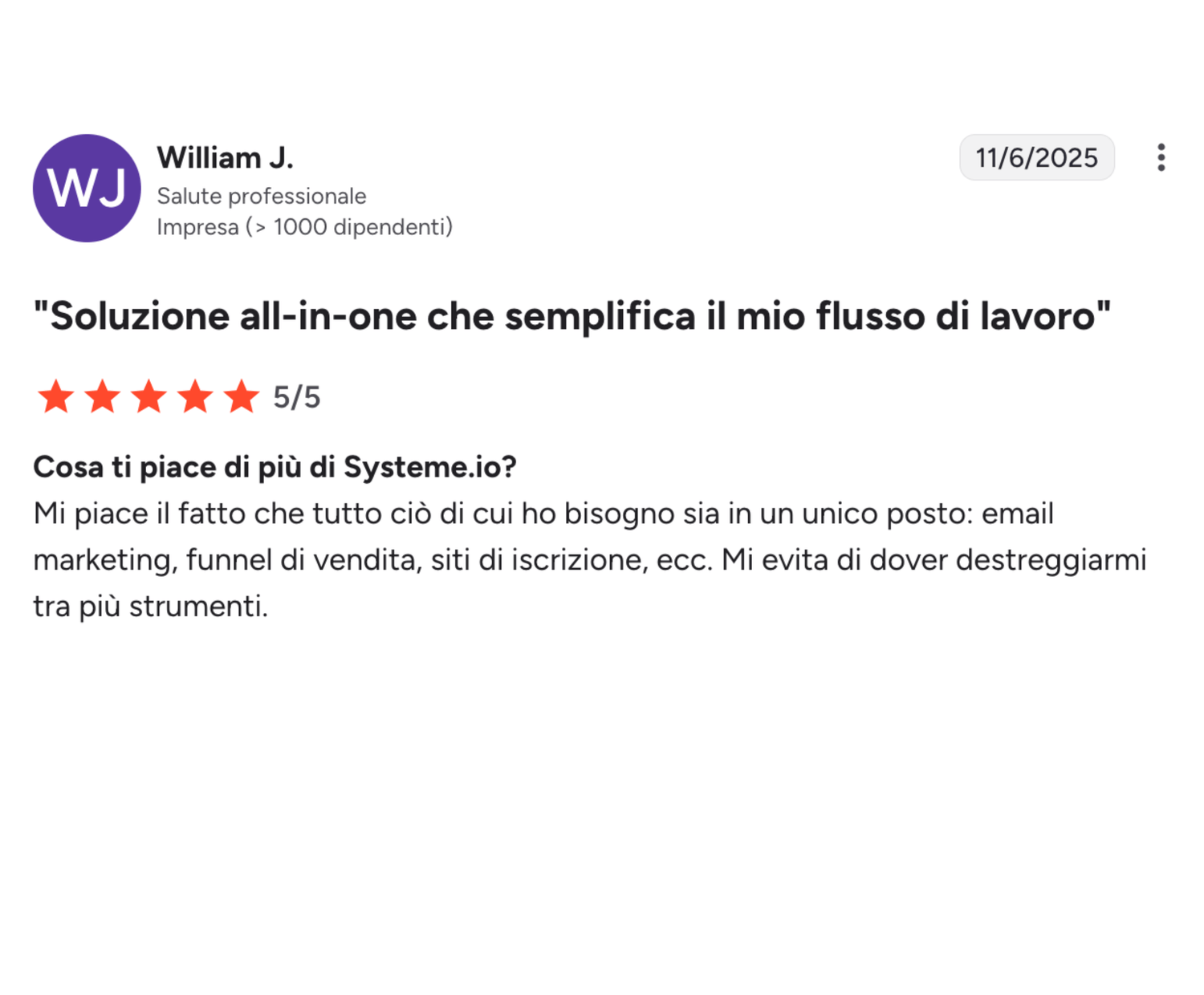 "In passato mi sono reso la vita molto più difficile (non sapendo come fare) avendo un sito web da una parte, un provider di email marketing dall'altra, cercando di integrare il costruttore di corsi con una terza parte... Sono davvero felice di crescere insieme a Systeme.io, grazie per aver reso la gestione