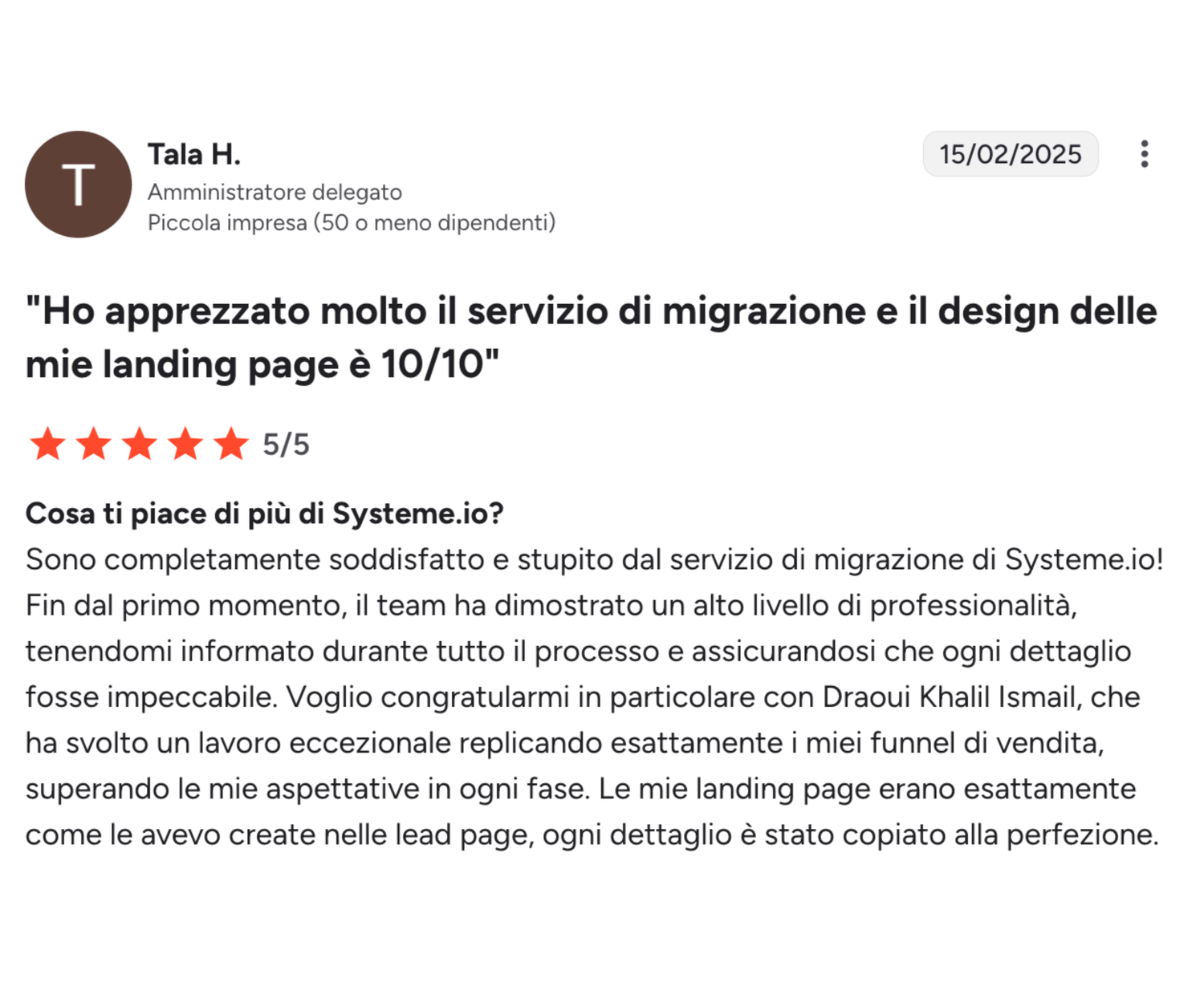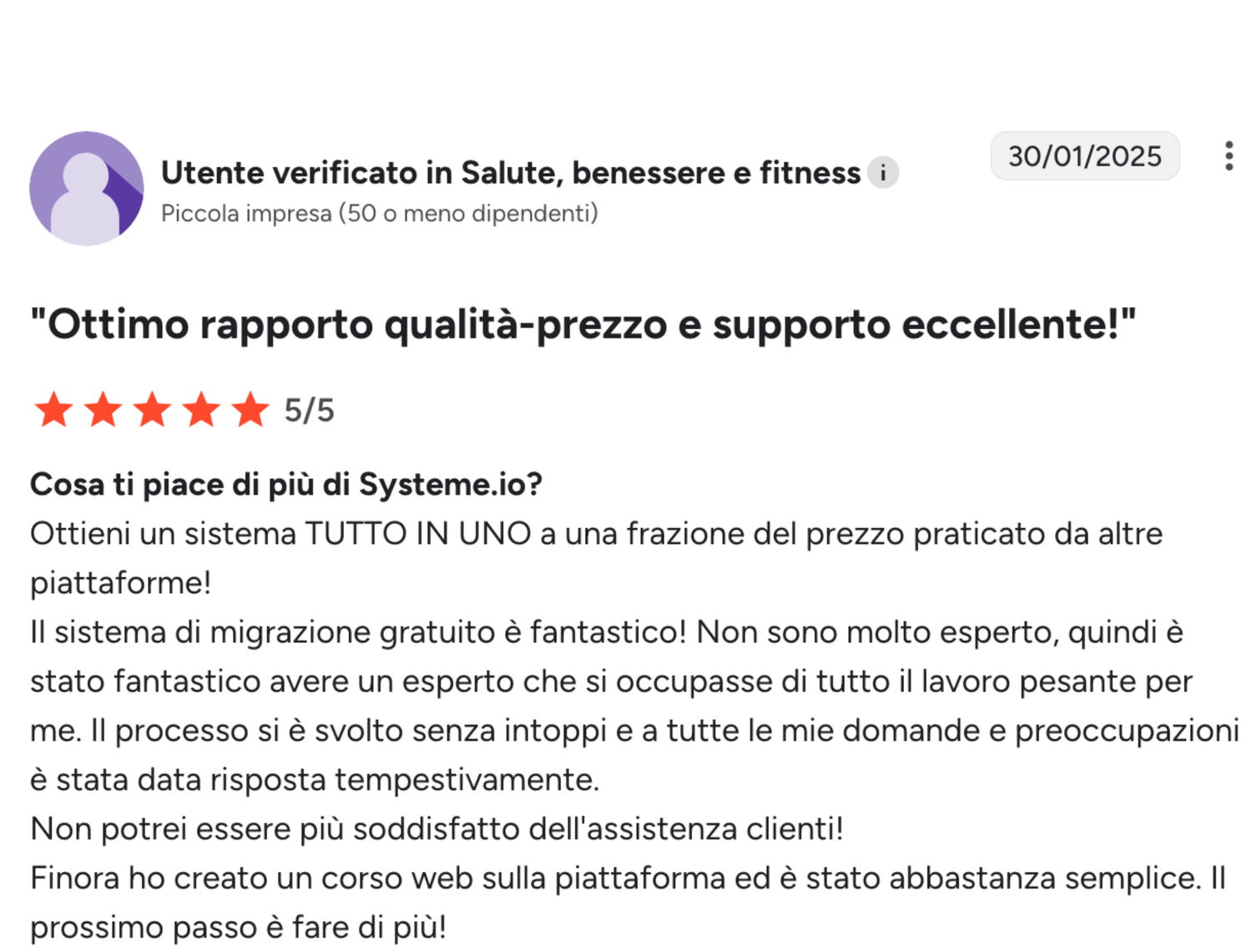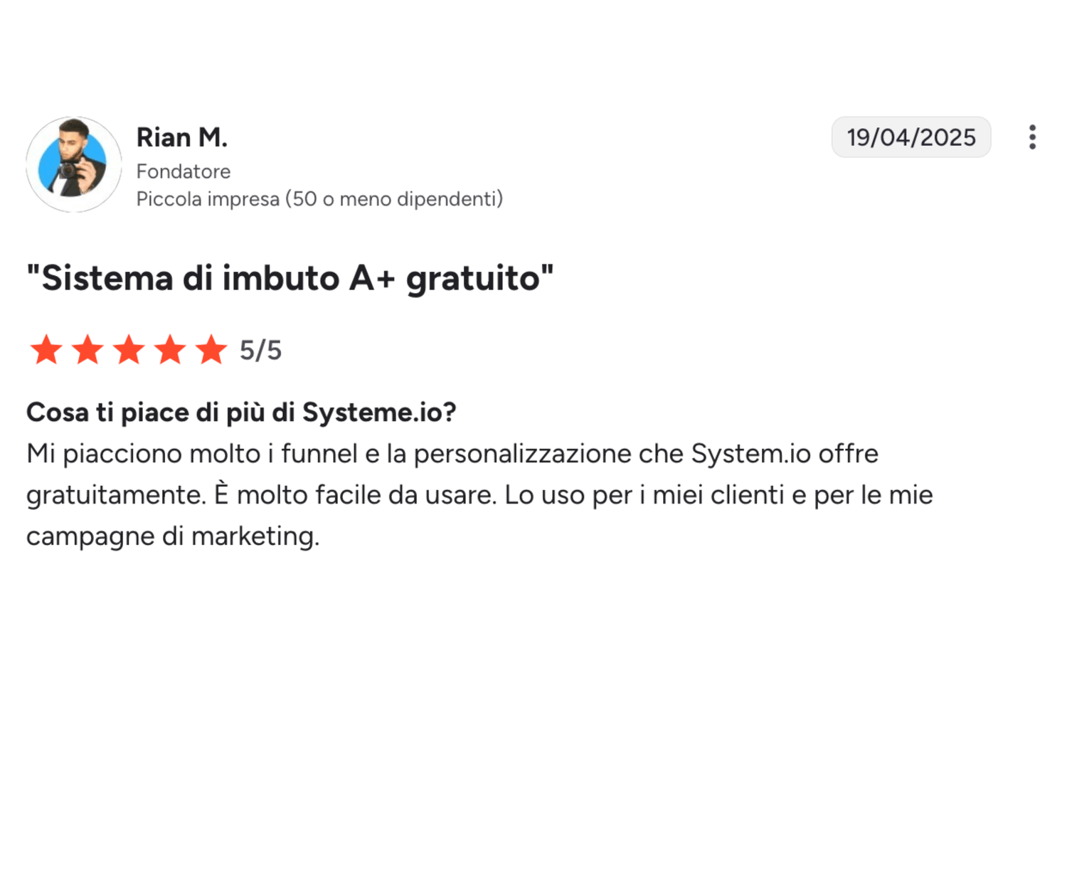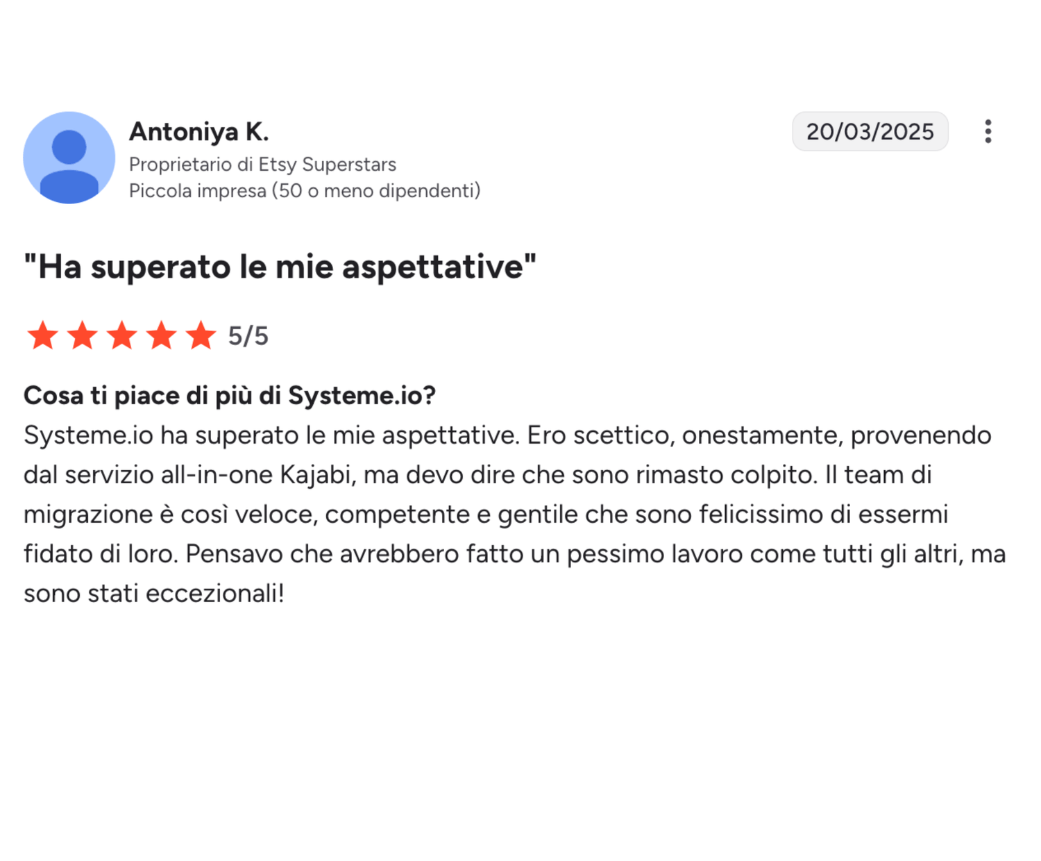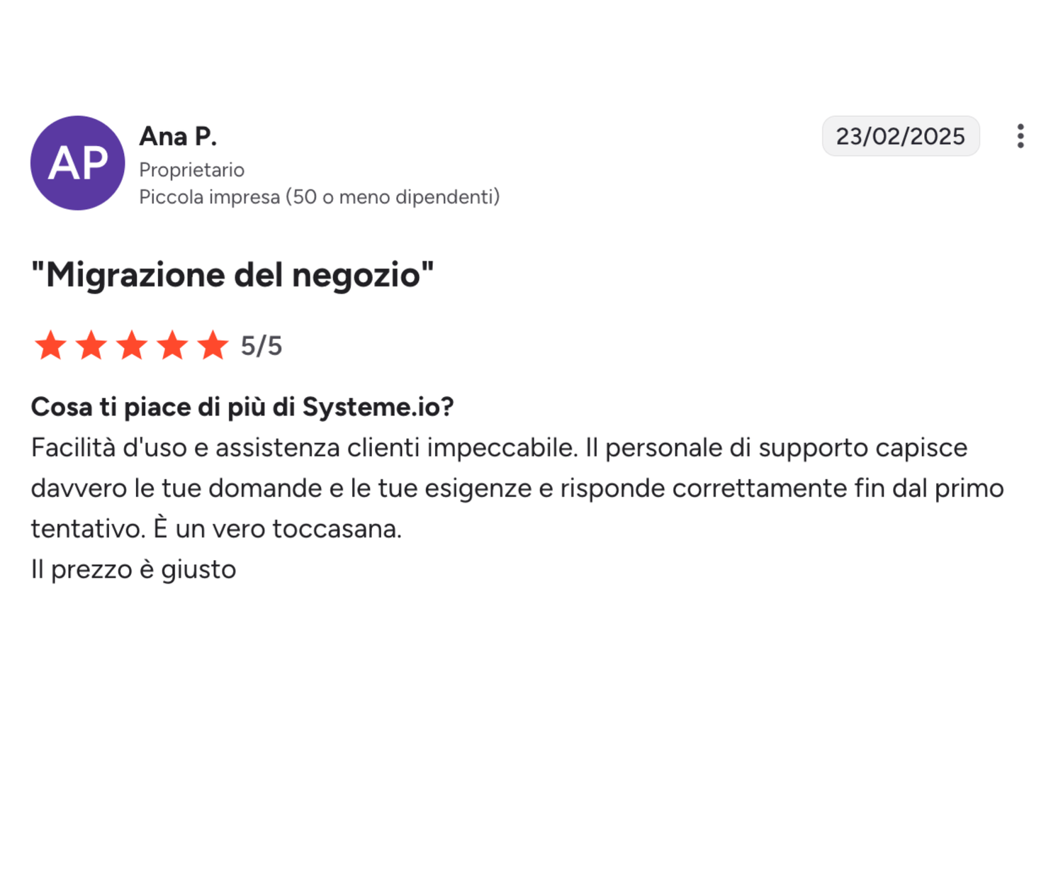 "In passato mi sono reso la vita molto più difficile (non sapendo come fare) avendo un sito web da una parte, un provider di email marketing dall'altra, cercando di integrare il costruttore di corsi con una terza parte... Sono davvero felice di crescere insieme a Systeme.io, grazie per aver reso la gestione