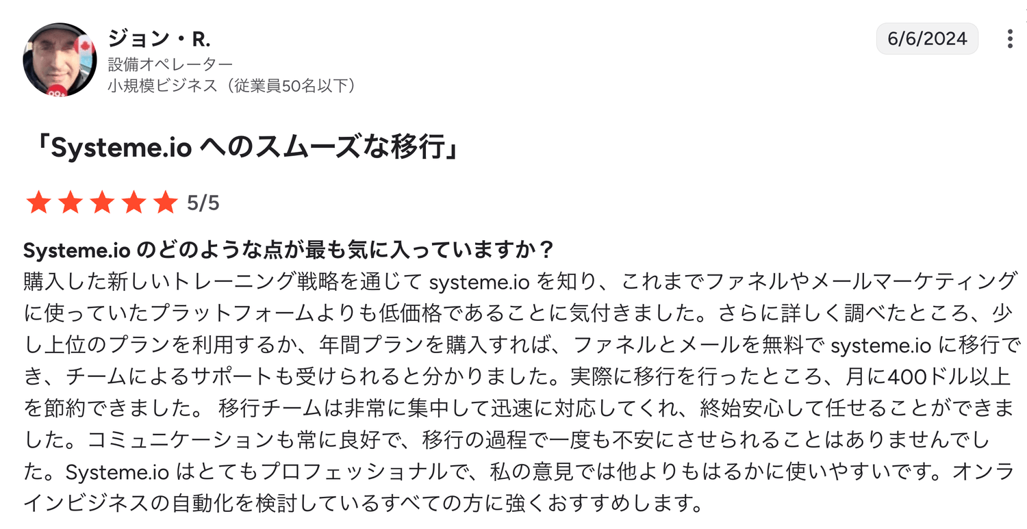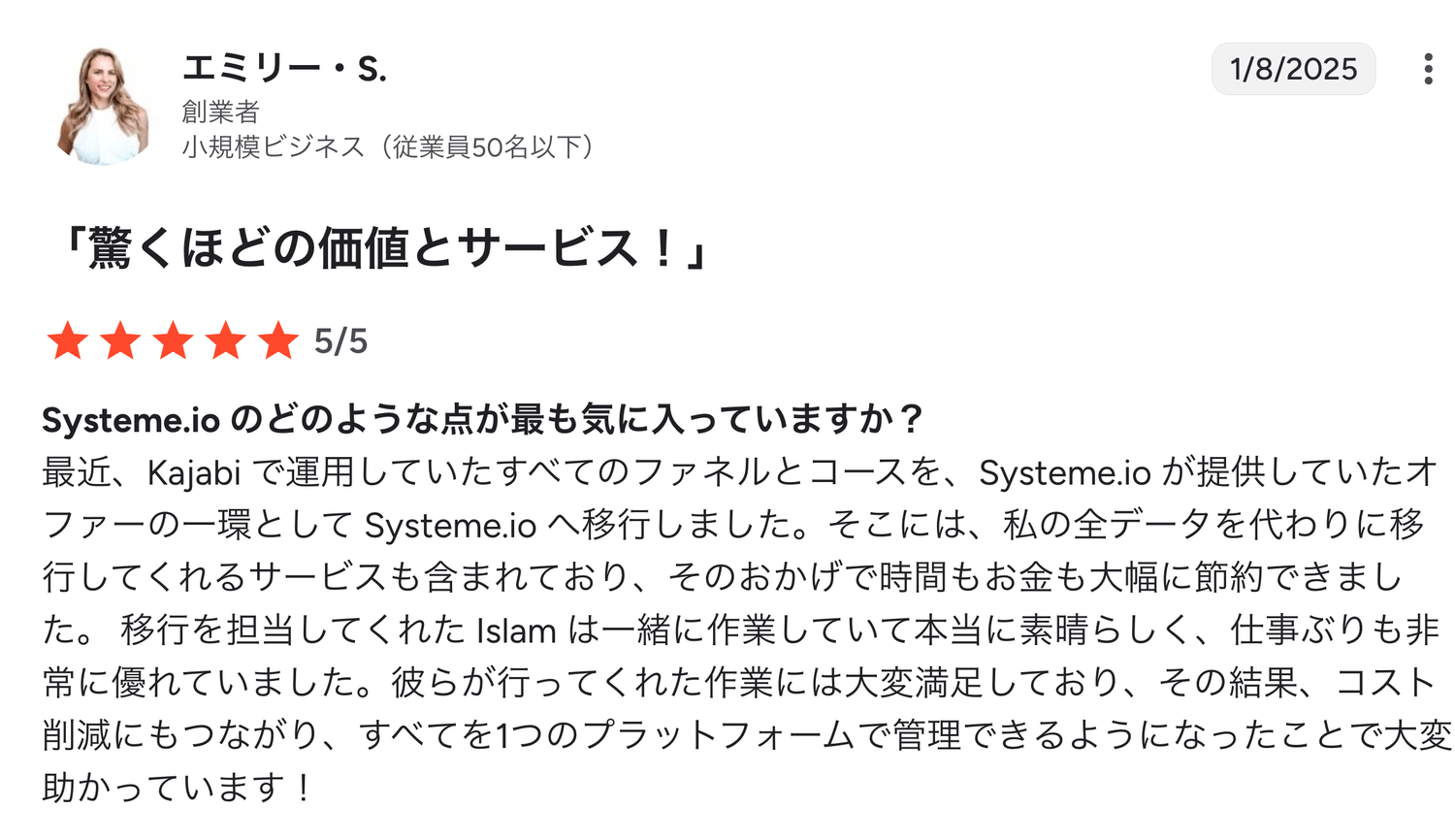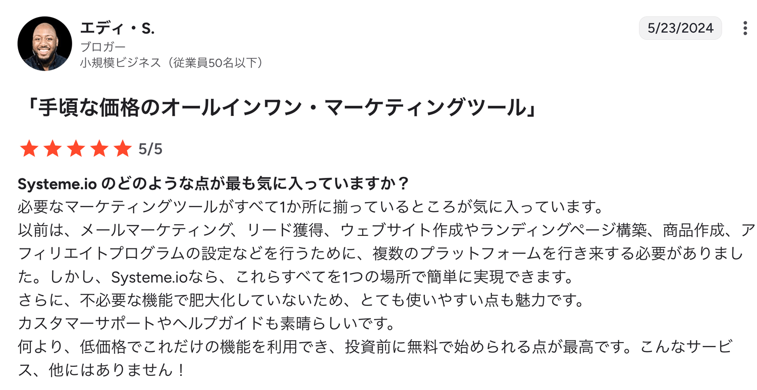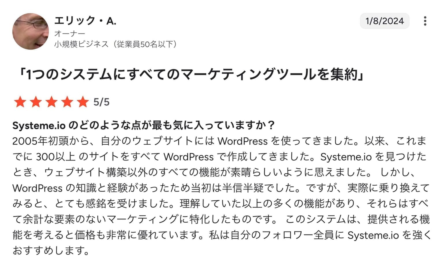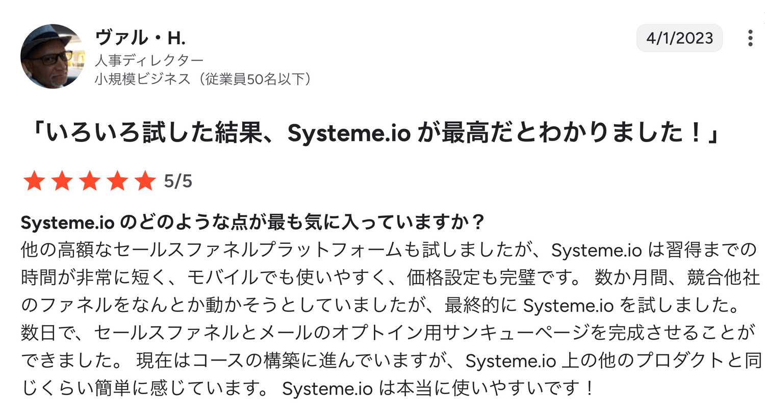 “以前は BuilderAll、ClickFunnels、その他多くのサービスを使っていましたが、Systeme.io は圧倒的に使いやすく、最高のコストパフォーマンスです。”