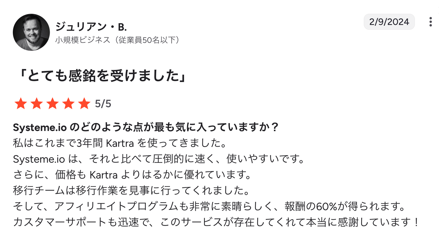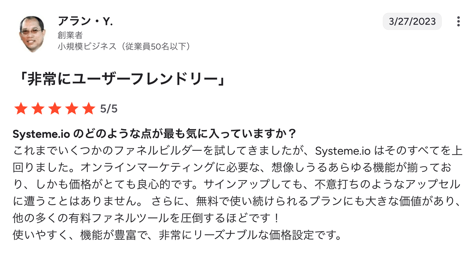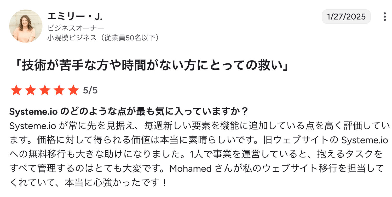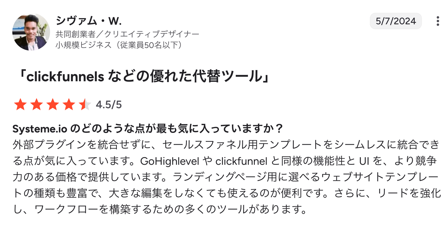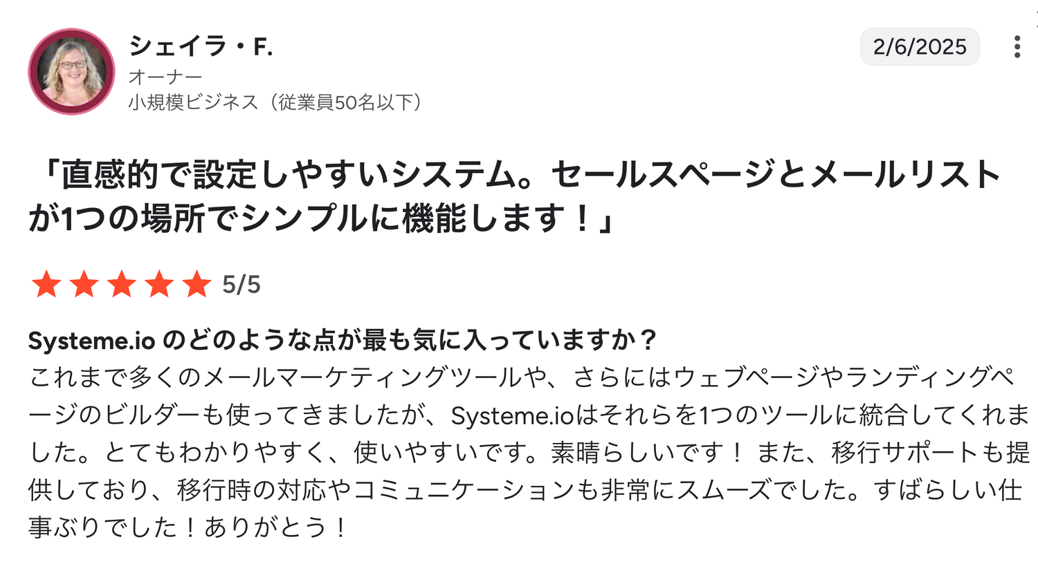 “以前は BuilderAll、ClickFunnels、その他多くのサービスを使っていましたが、Systeme.io は圧倒的に使いやすく、最高のコストパフォーマンスです。”