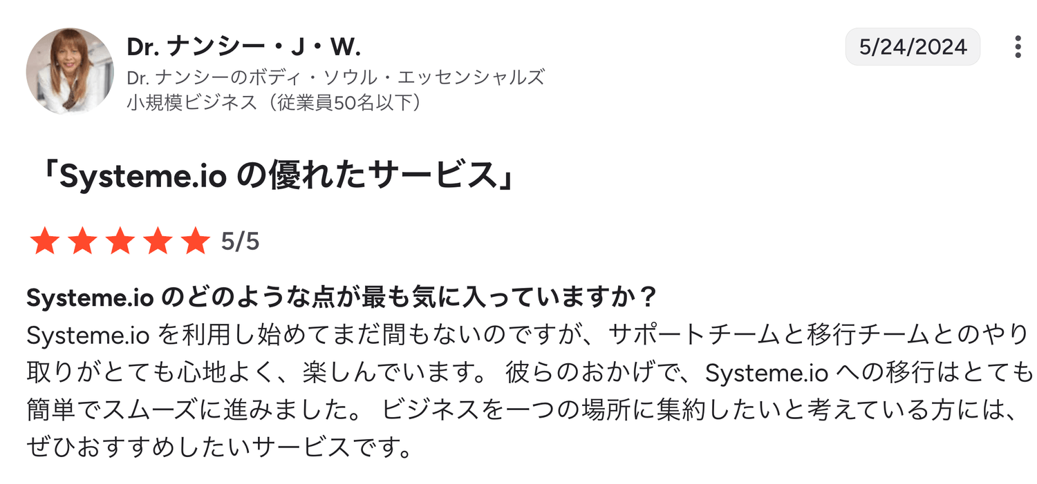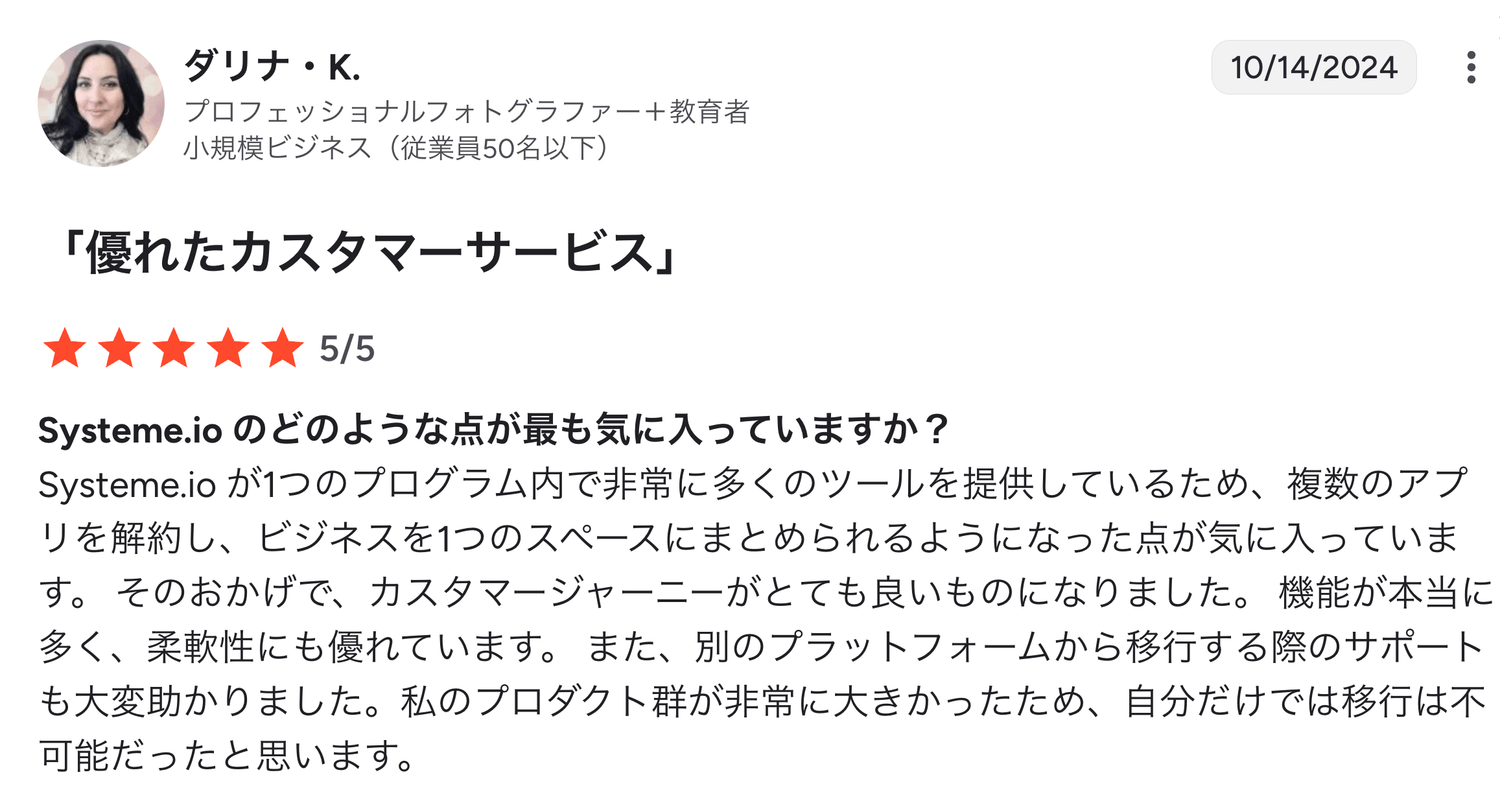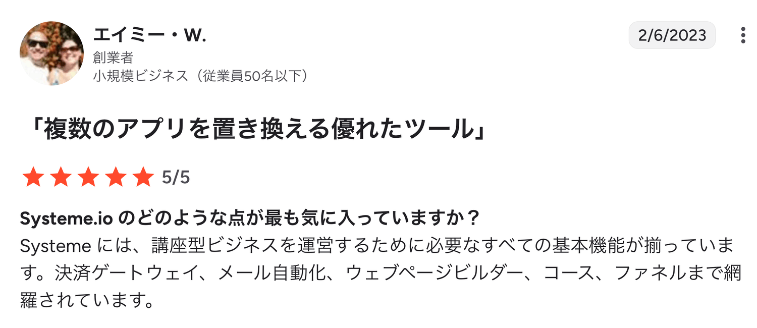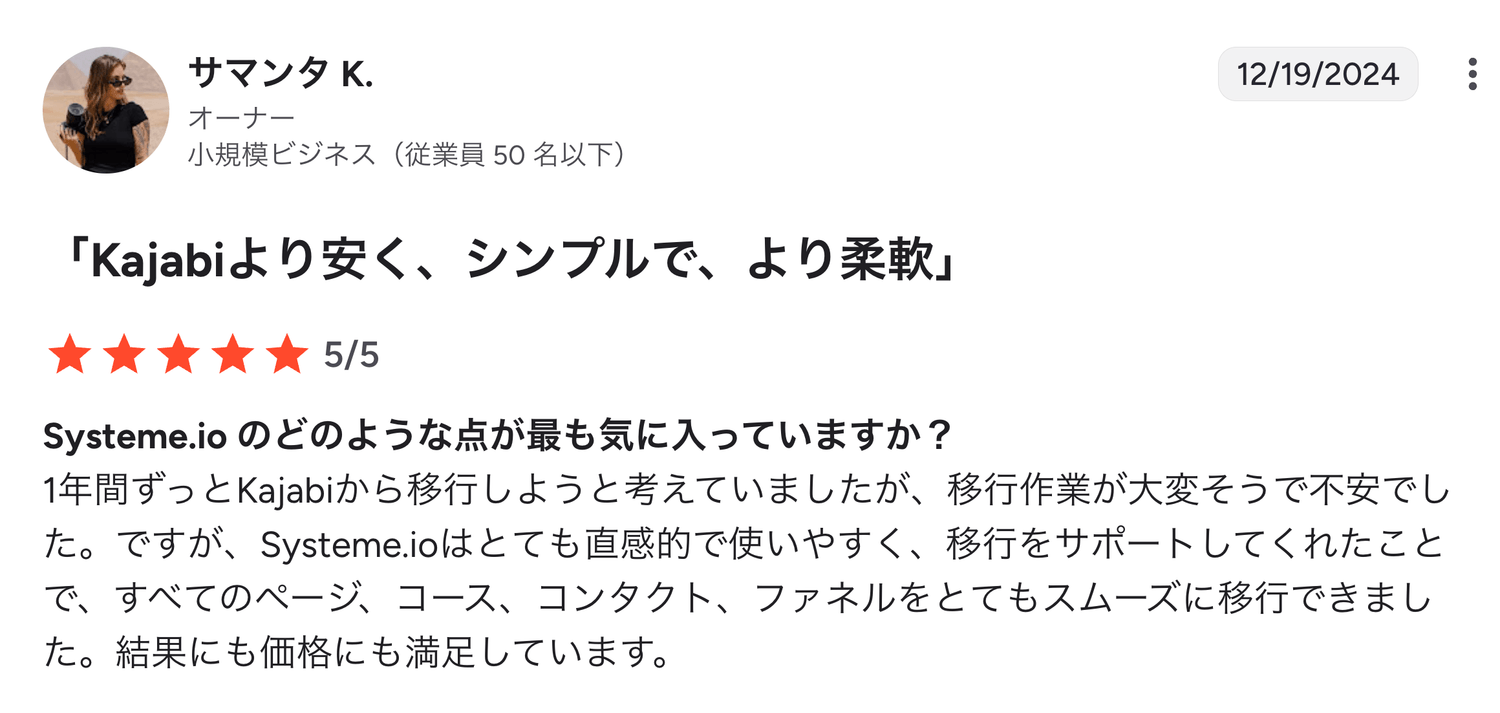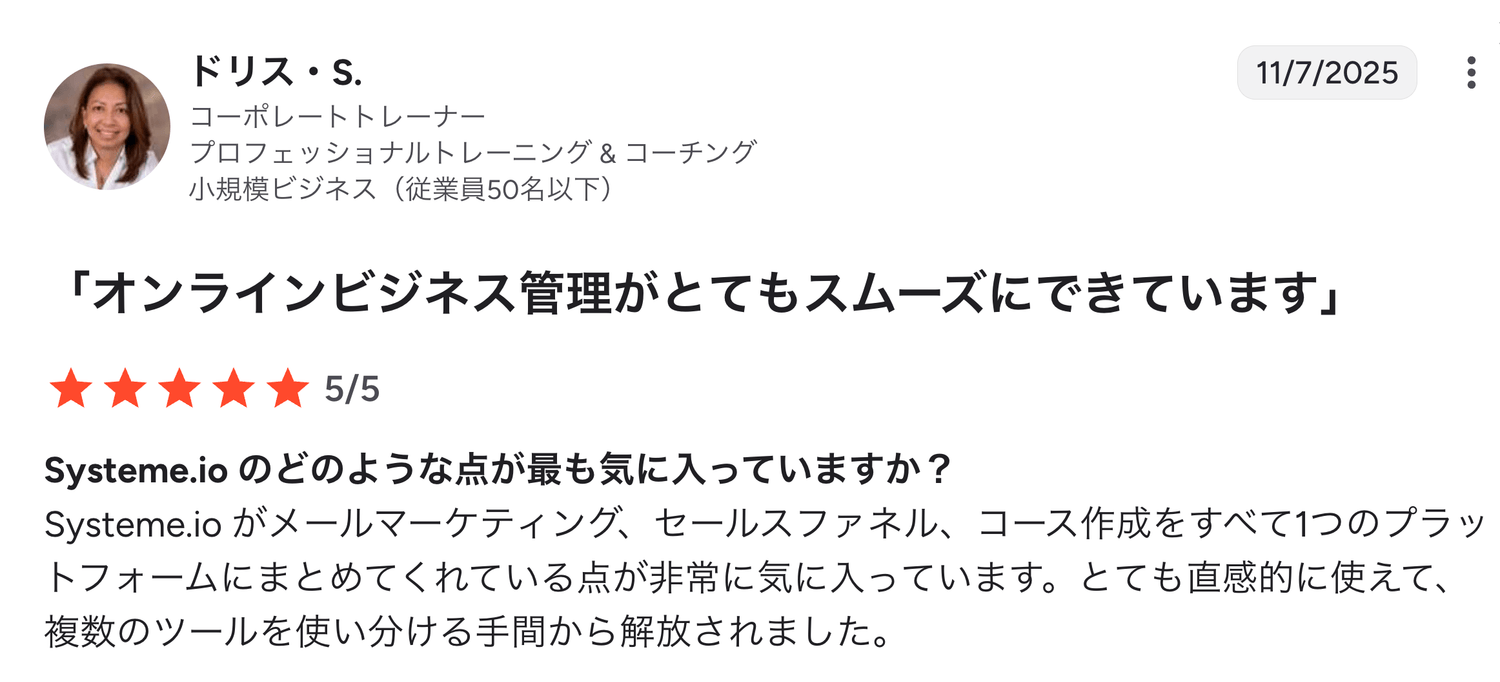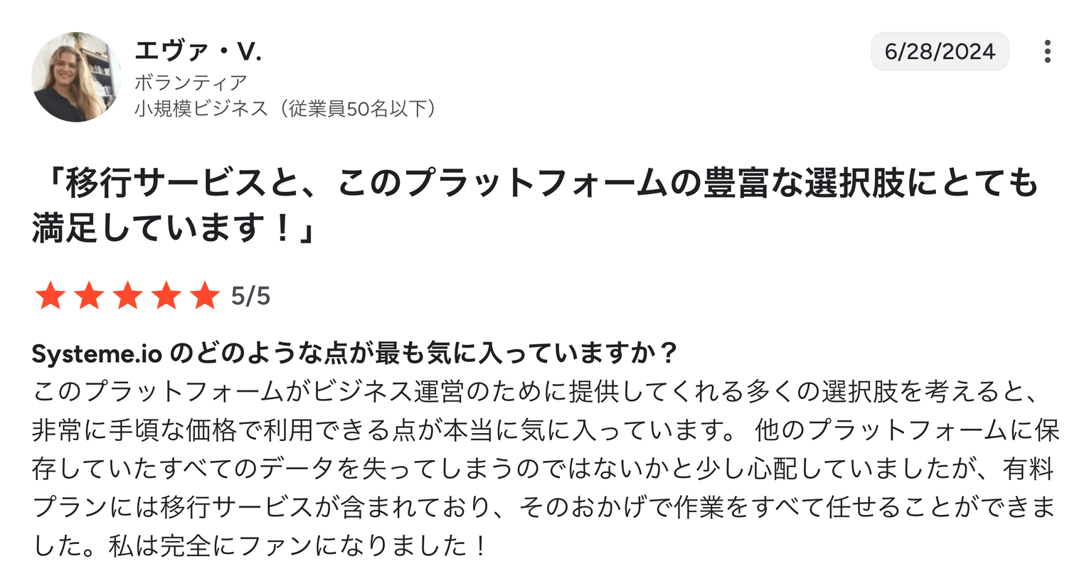 “以前は BuilderAll、ClickFunnels、その他多くのサービスを使っていましたが、Systeme.io は圧倒的に使いやすく、最高のコストパフォーマンスです。”