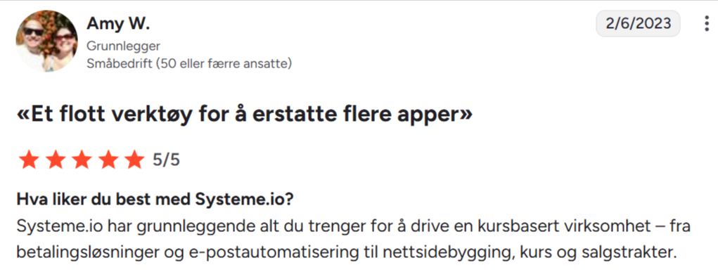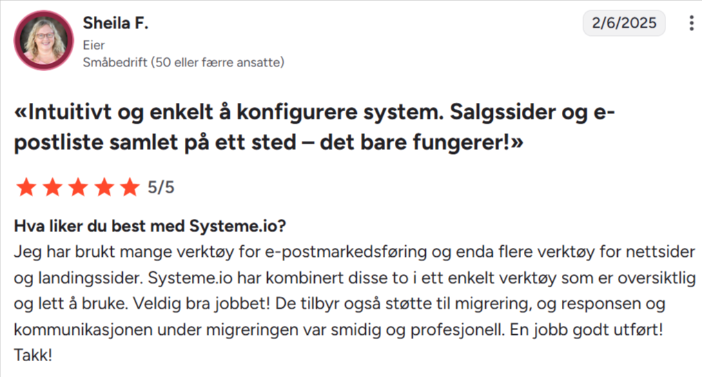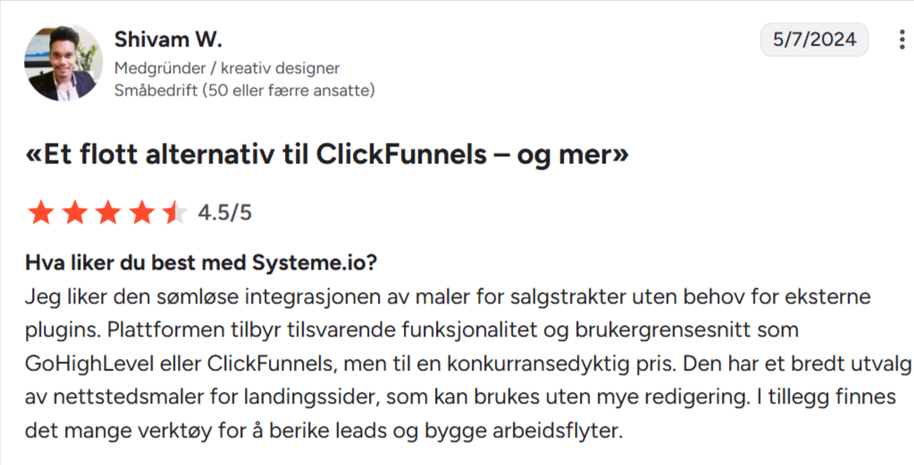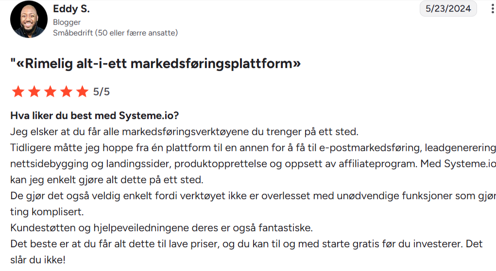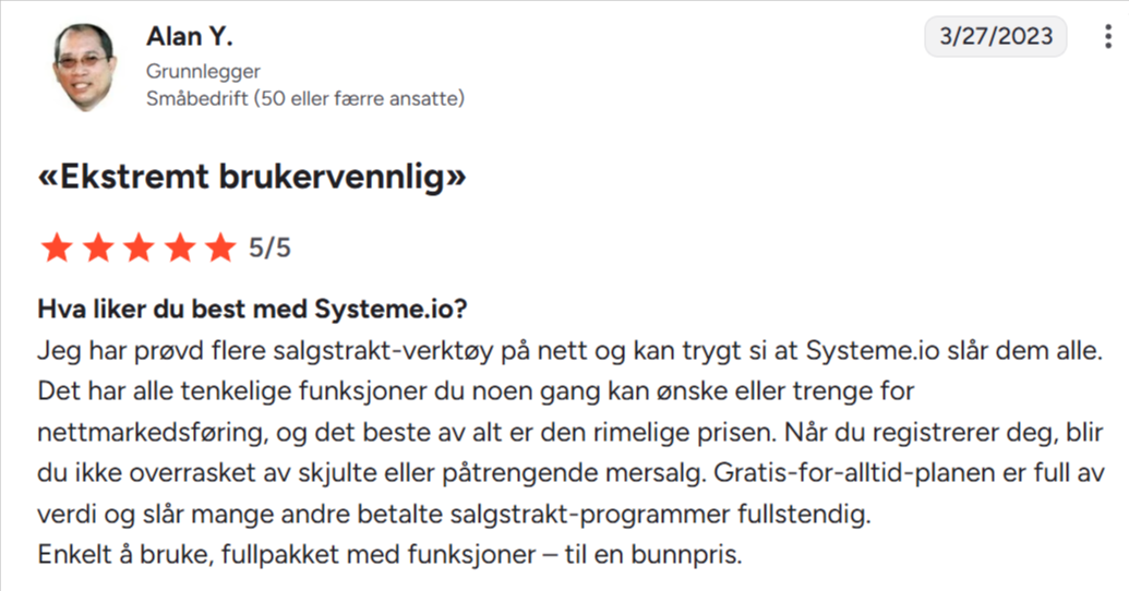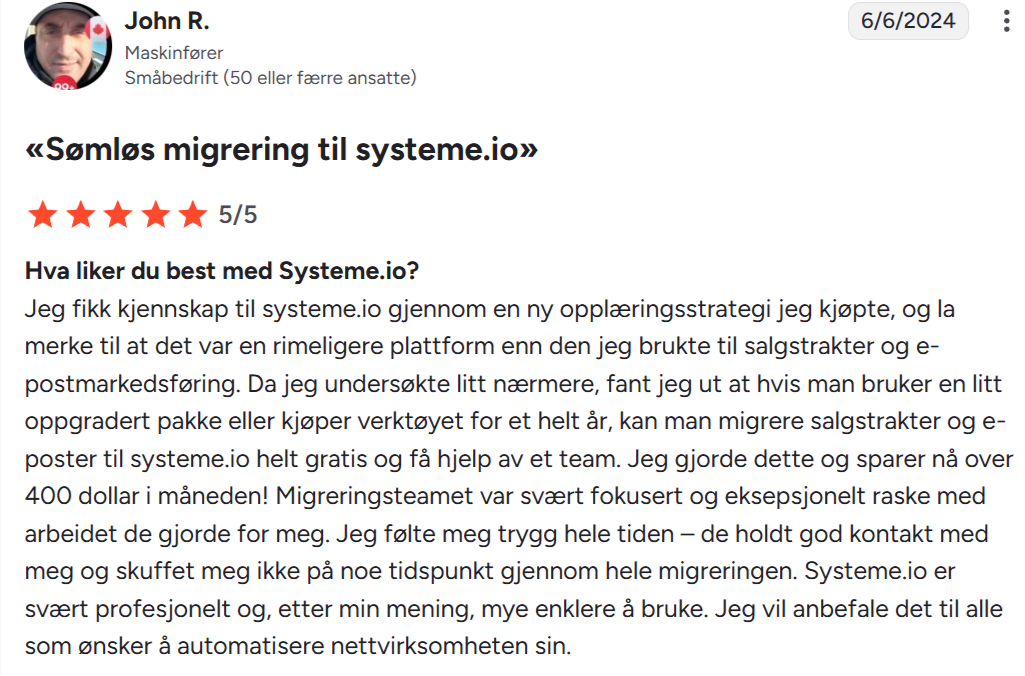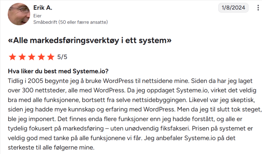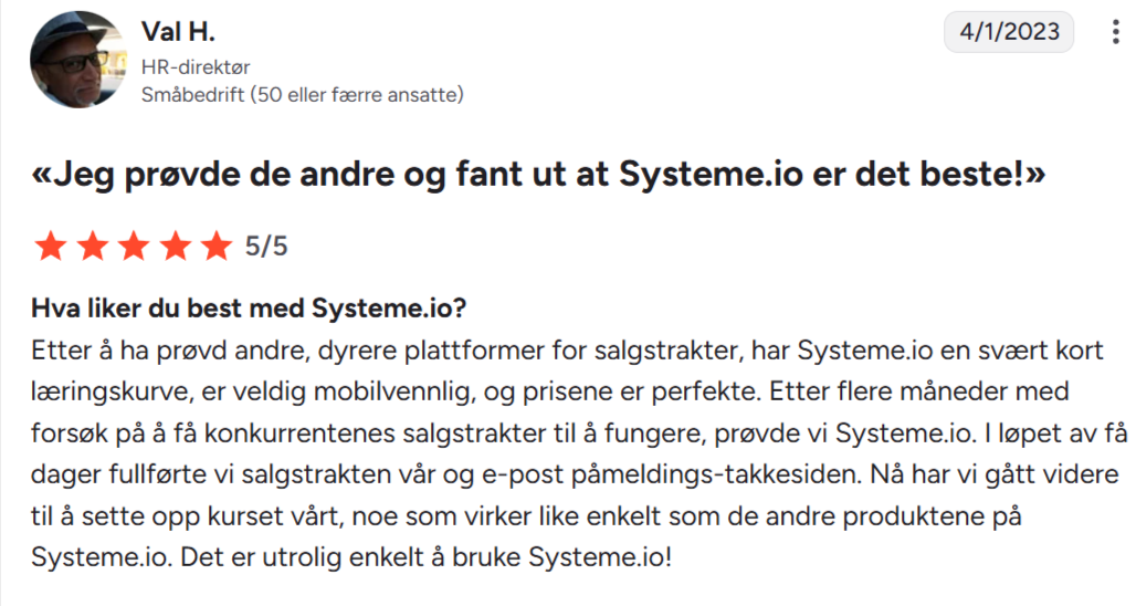 «Jeg har brukt BuilderAll, ClickFunnels og mange andre. Systeme.io er uten tvil det enkleste og gir best verdi for pengene.»