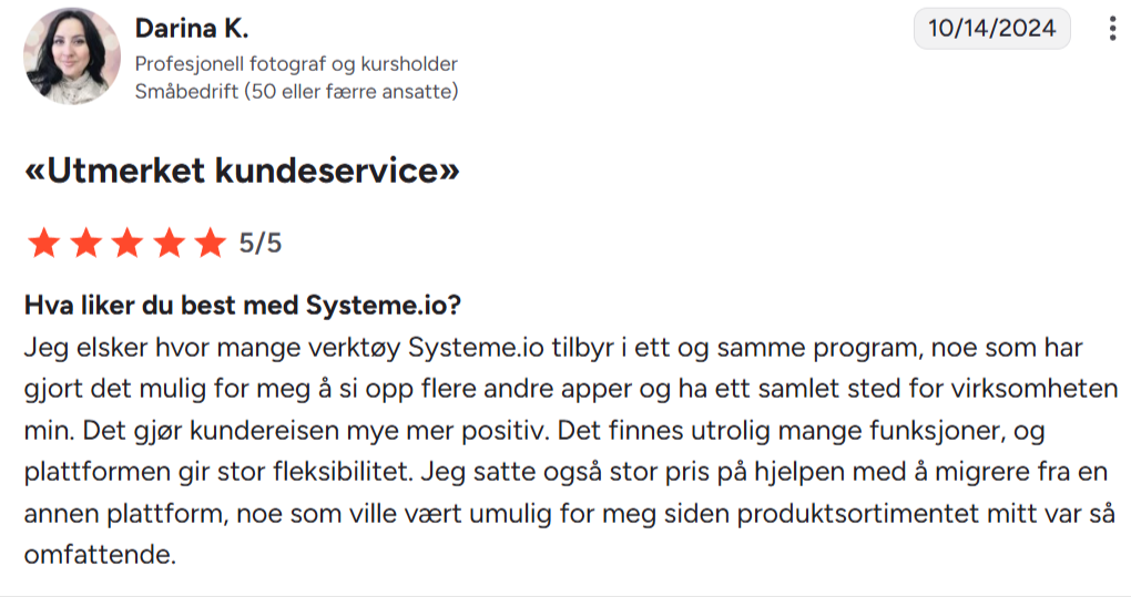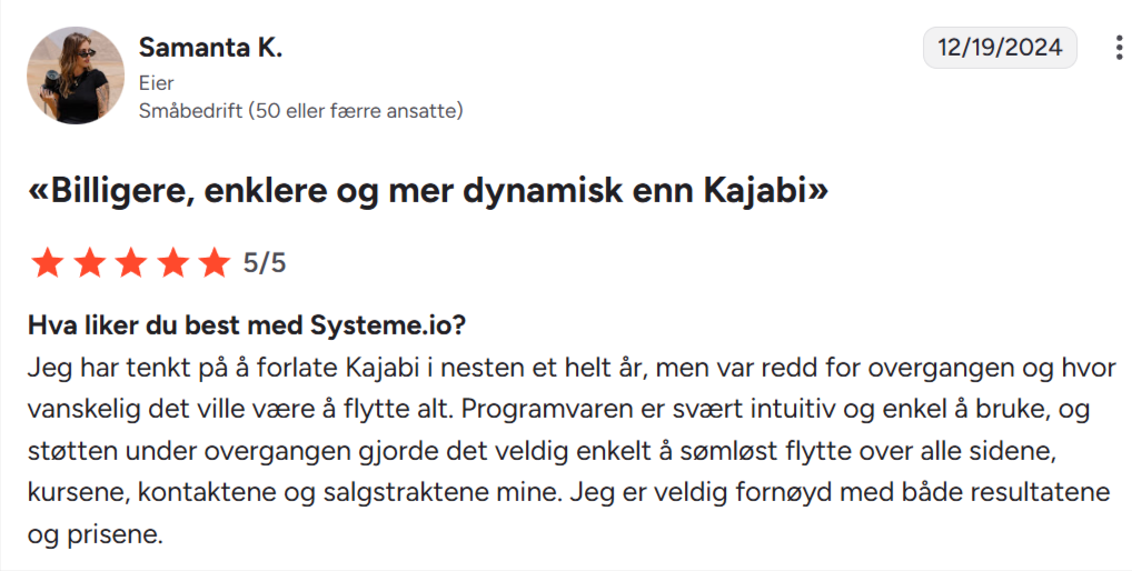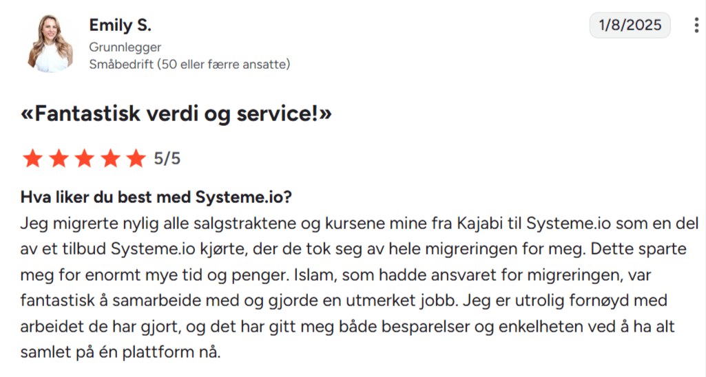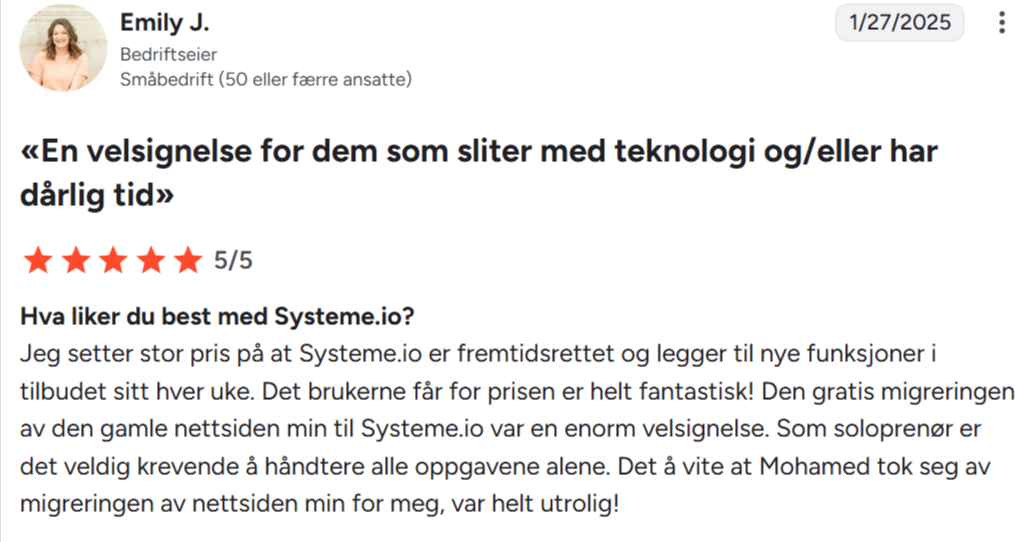 «Jeg elsker at Systeme.io tilbyr så mange funksjoner på én og samme plattform. Jeg har brukt det daglig i nesten to år uten å ha hatt noen problemer. Jeg har laget salgstrakter, e-postautomatisering og en blogg, noe jeg ikke kan gjøre noe annet sted. Funksjonene er svært enkle å bruke, og kundestøtten er fantastisk.»