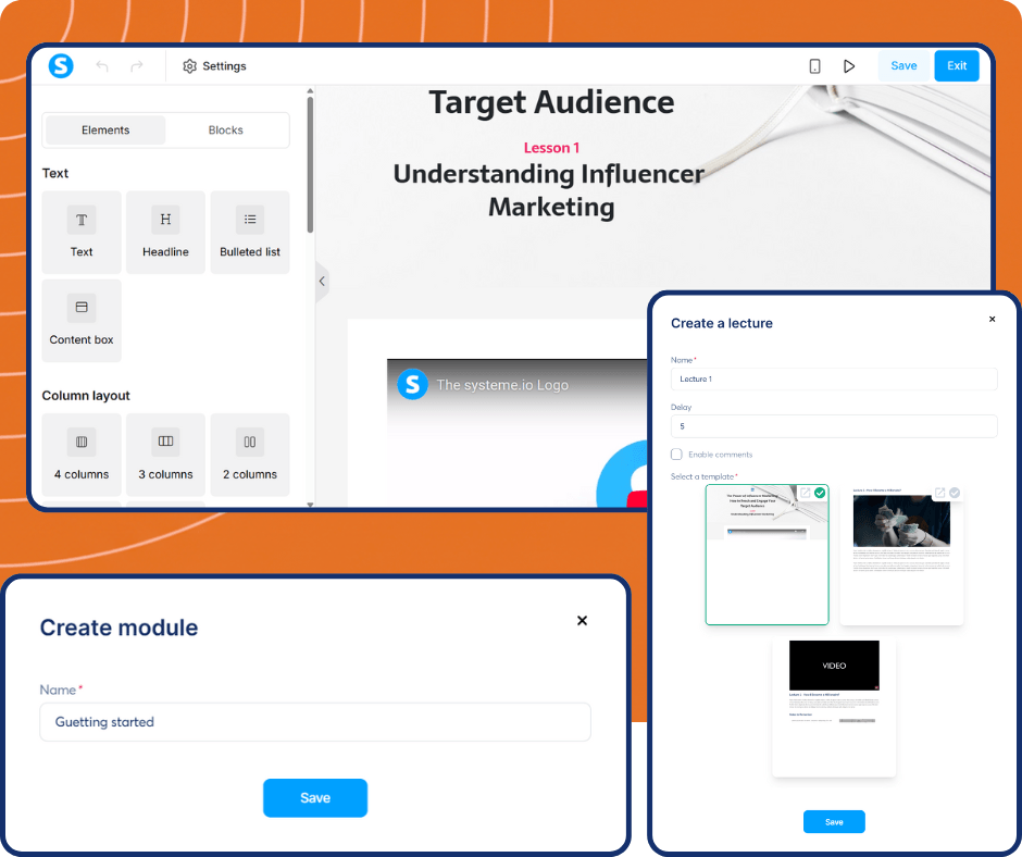 Create a professional learning experience. Add modules and lectures in a few clicks, then use the drag-and-drop editor to add videos, text, and resources to your lessons