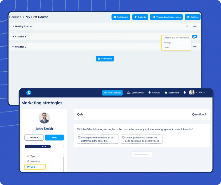 Ensure your students are learning. Add interactive quizzes to any module with multiple-choice questions, and automatically grade their answers to track their understanding