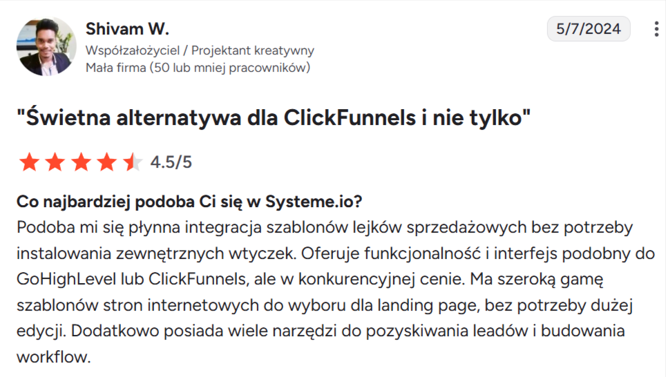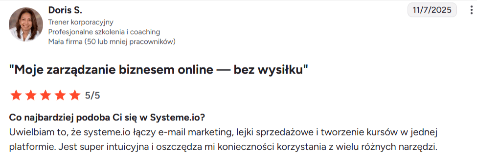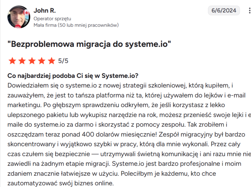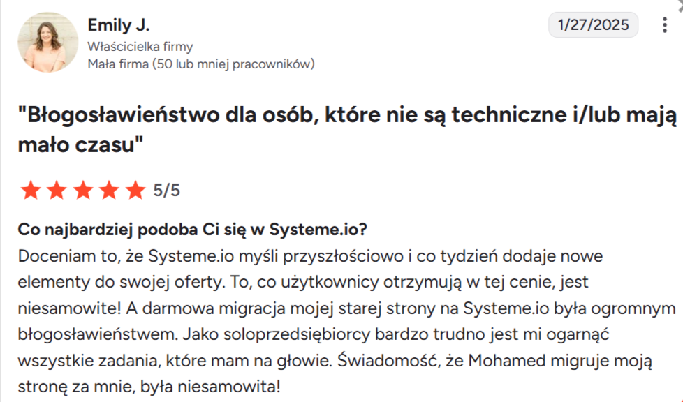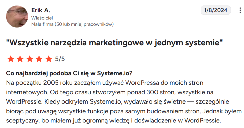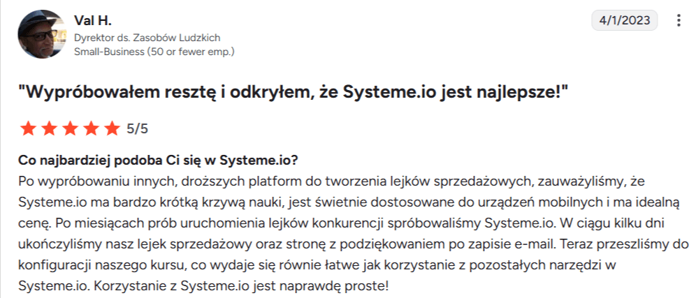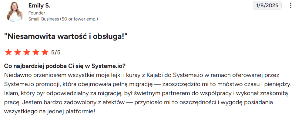 “Uwielbiam to, że Systeme.io oferuje tak wiele funkcji na jednej platformie. Używam go codziennie od prawie dwóch lat i nigdy nie miałem żadnych problemów. Stworzyłem lejki, automatyzację e-mail i blog — czego nie byłem w stanie zrobić nigdzie indziej. Funkcje są super łatwe w użyciu, a obsługa klienta jest świetna.”