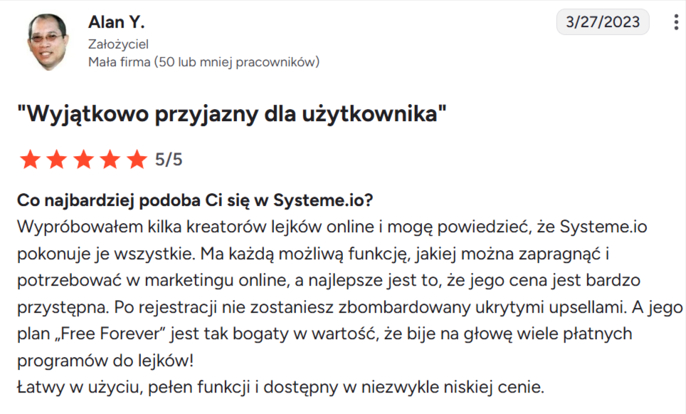 “Cena jest świetna. Łatwość obsługi edytora jest bezkonkurencyjna. Prawie wszystko jest wliczone — e-mail marketing, lejki, upselle, downselle, kursy, członkostwa itd.”