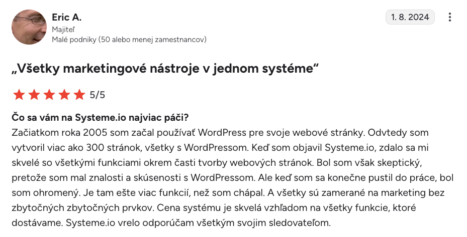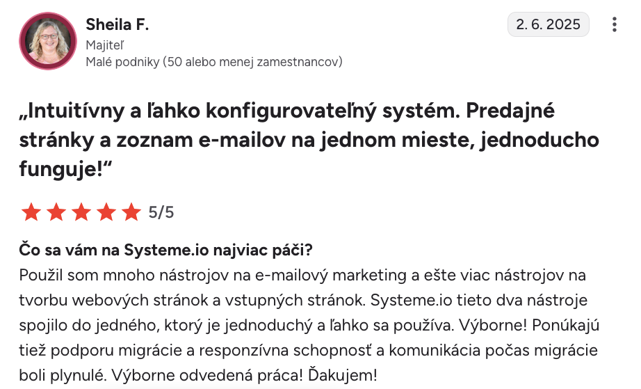 “Milujem to, že Systeme.io ponúka toľko funkcií na jednej platforme. Používam ho denne už takmer dva roky a nemal som žiadne problémy. Vytvoril som konverzné lieviky, e-mailovú automatizáciu a blog, čo inde nedokážem. Funkcie sú super ľahko použiteľné a zákaznícka podpora je skvelá.”