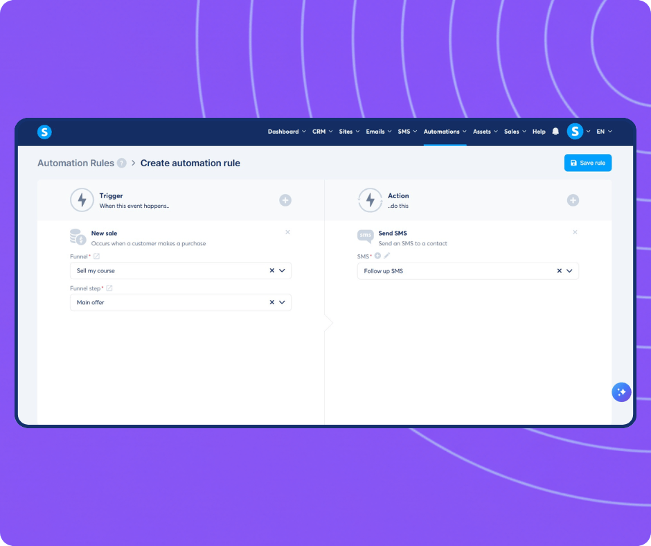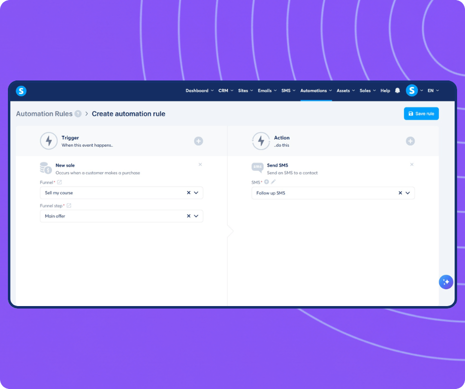 Add SMS steps directly into your automation rules. Automatically send a confirmation text when a client buys a course