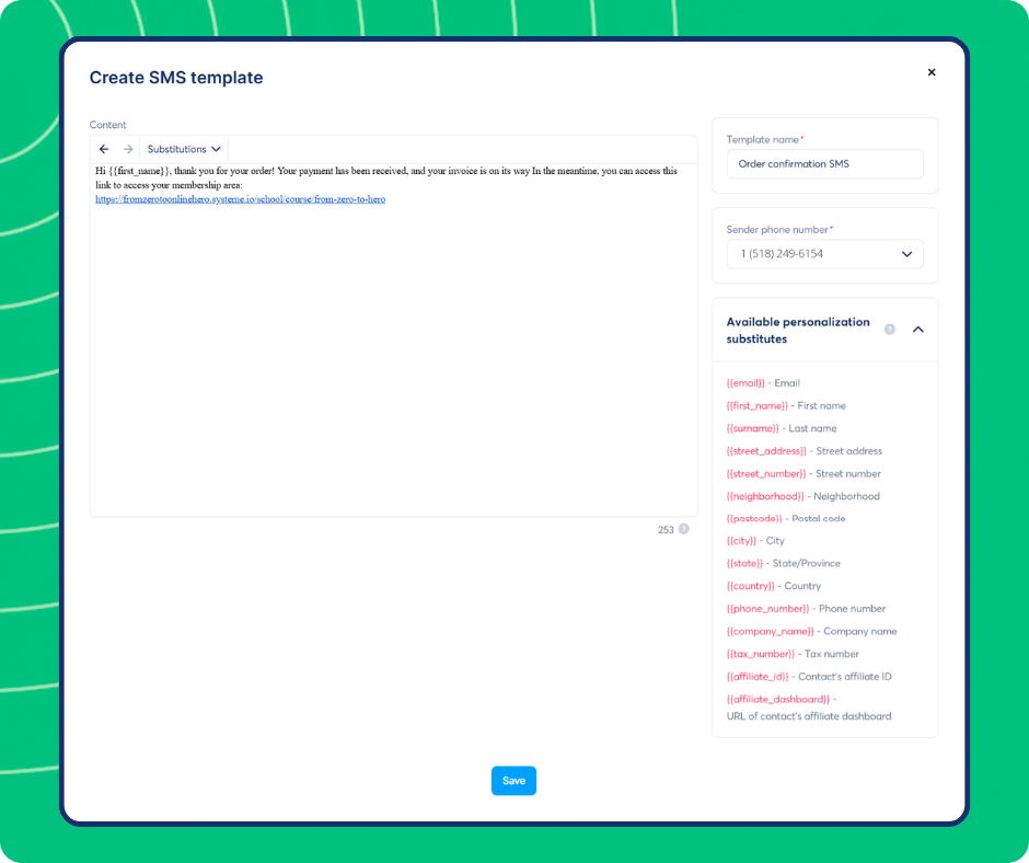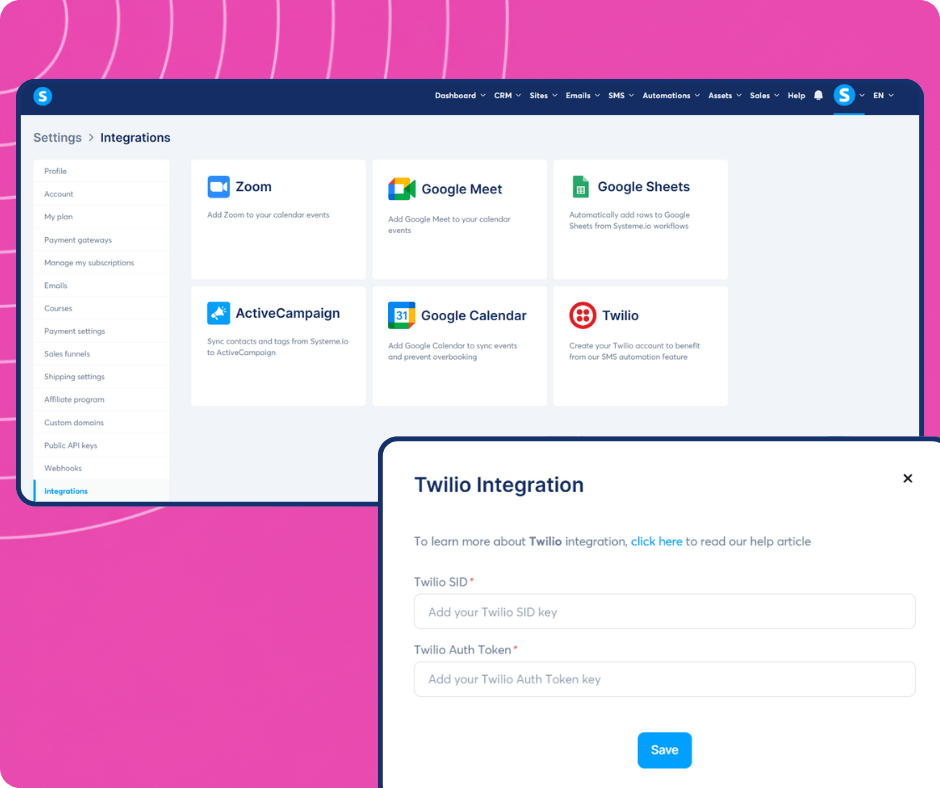 No coding required. Simply paste your Twilio SID and Auth Token into your systeme.io settings to link your account securely and start sending immediately