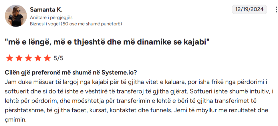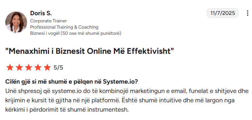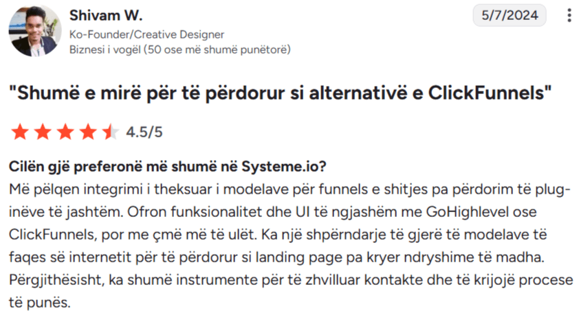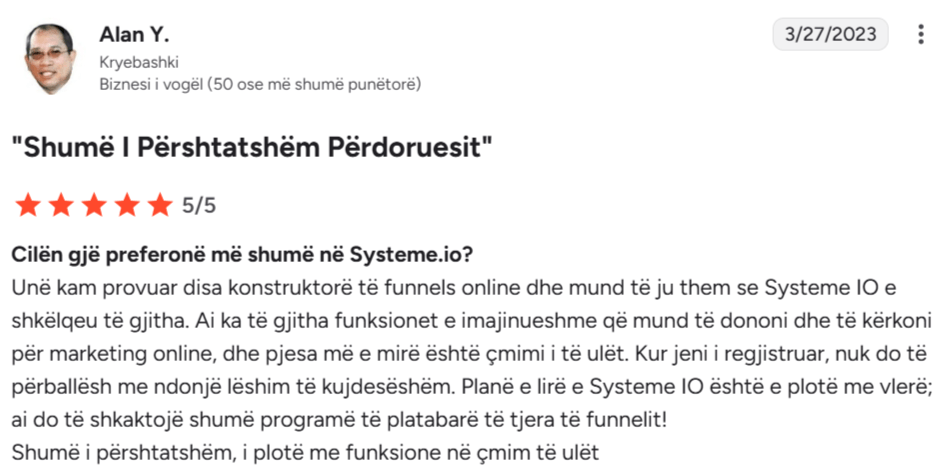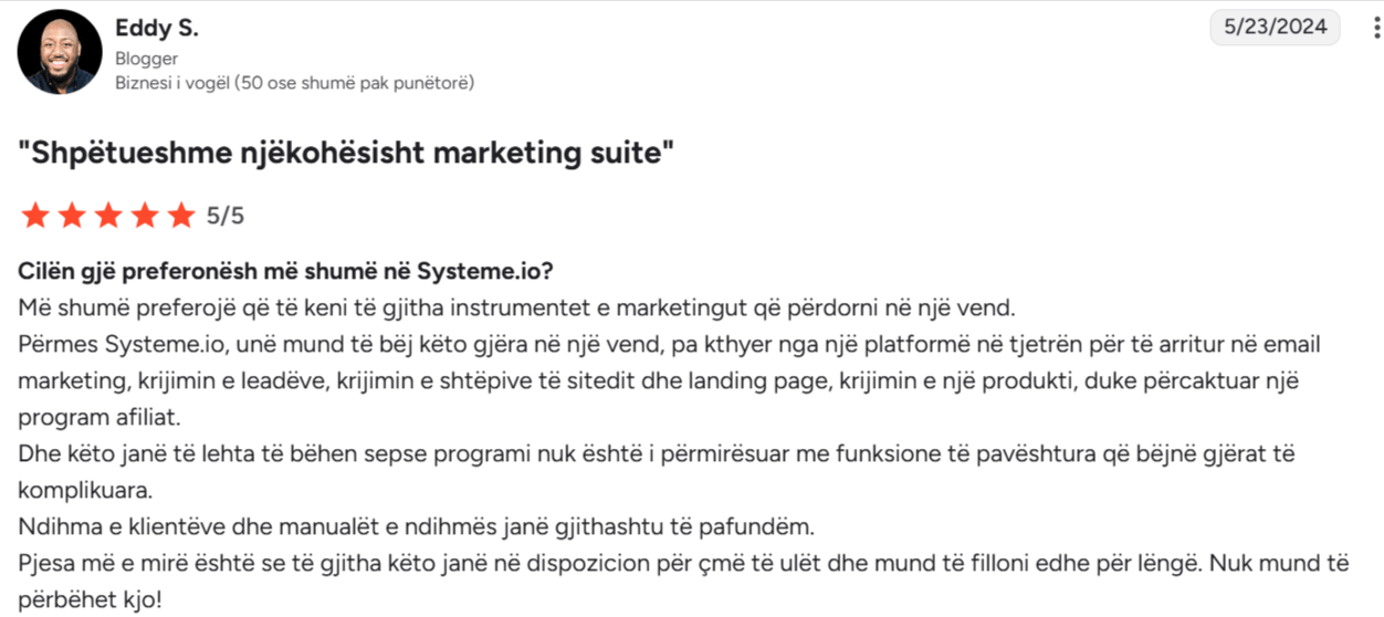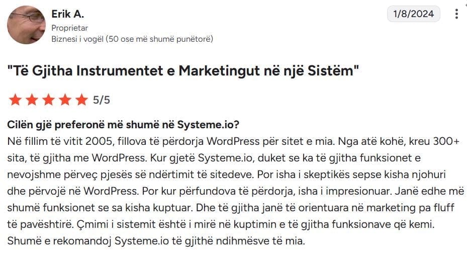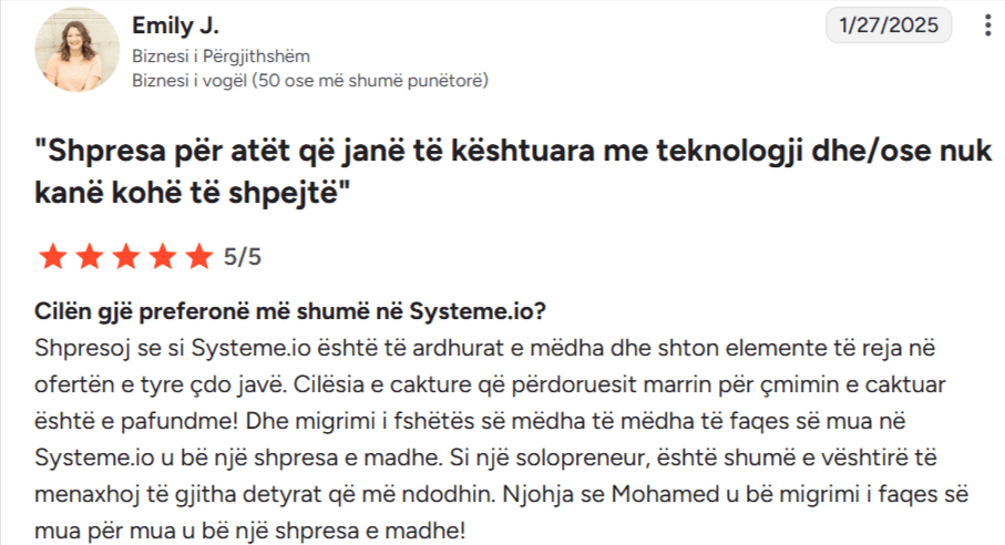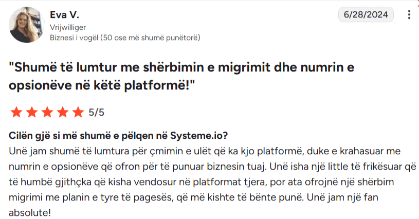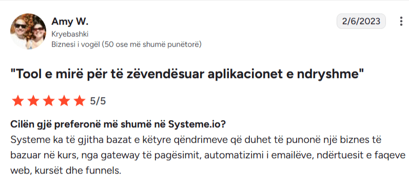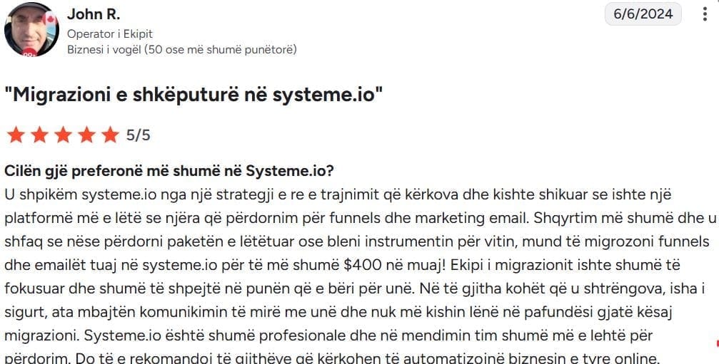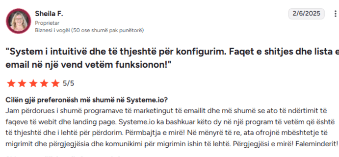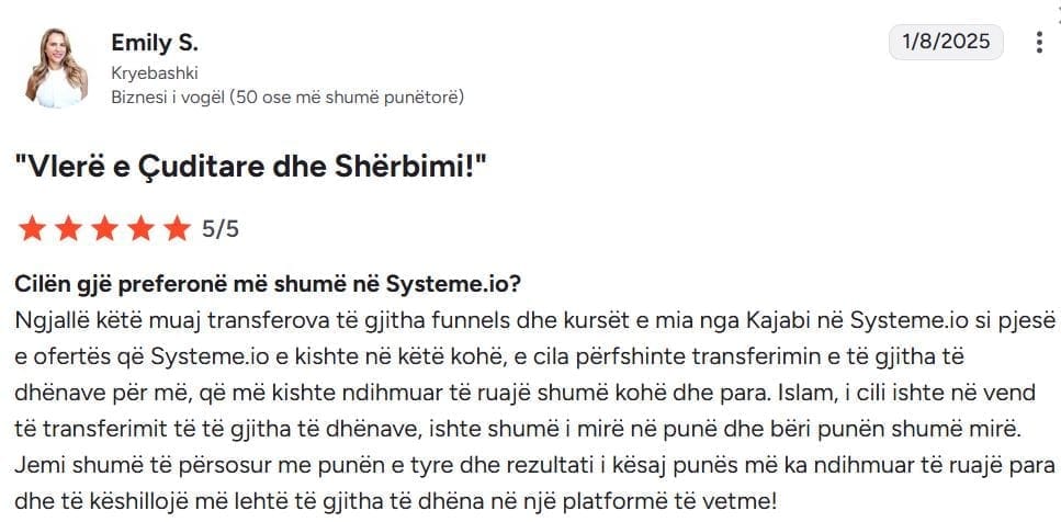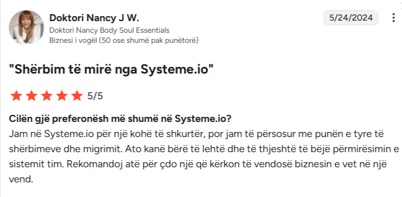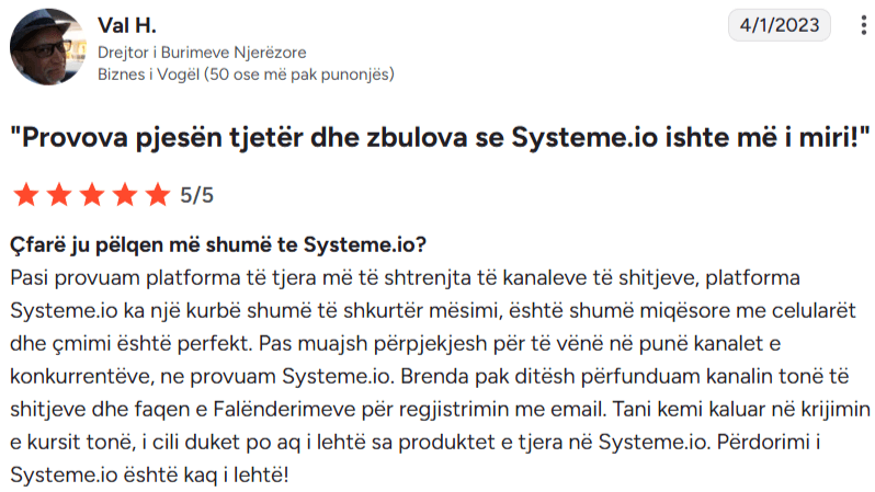 "Jeni i pafundëm të faktit që Systeme.io ofron shumë funksione në një platformë. Përdorja të pafundëm në mënyrë të përditësuar për në të dy vjet dhe nuk kam pasur asnjë problem. Këtu këmija kanale, automatizim të email-it dhe një blog, që nuk mund të këmija në ndonjë vend tjetër. Funksionet janë shumë të lehta për përdorim, dhe mbështetja e klientit është e pafundëm."