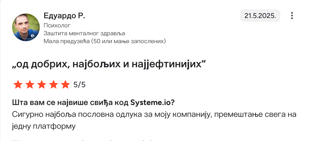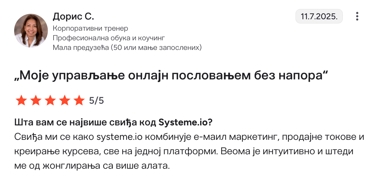 Systeme.io je pomogao hiljadama preduzetnika da pokrenu svoj biznis uz platformu koja je laka za korišćenje i ima sve alate koji su vam potrebni - sve na jednom mestu.