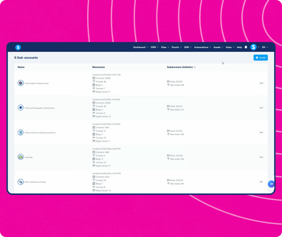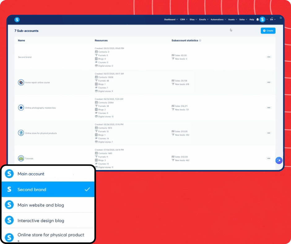 Create a dedicated sub-account for every new client or project with just one click. Each sub-account acts as a standalone account with its own funnels, emails, and payment gateways