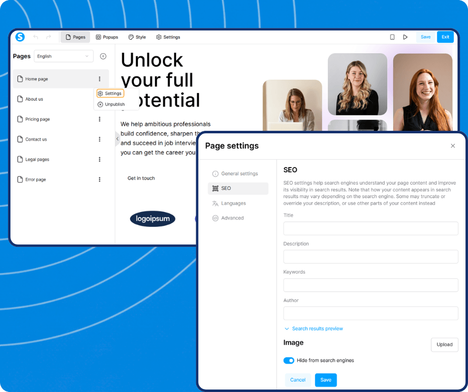 Control how you appear on Google. Edit your meta titles, descriptions, and keywords for every single page directly in the settings to boost your organic traffic