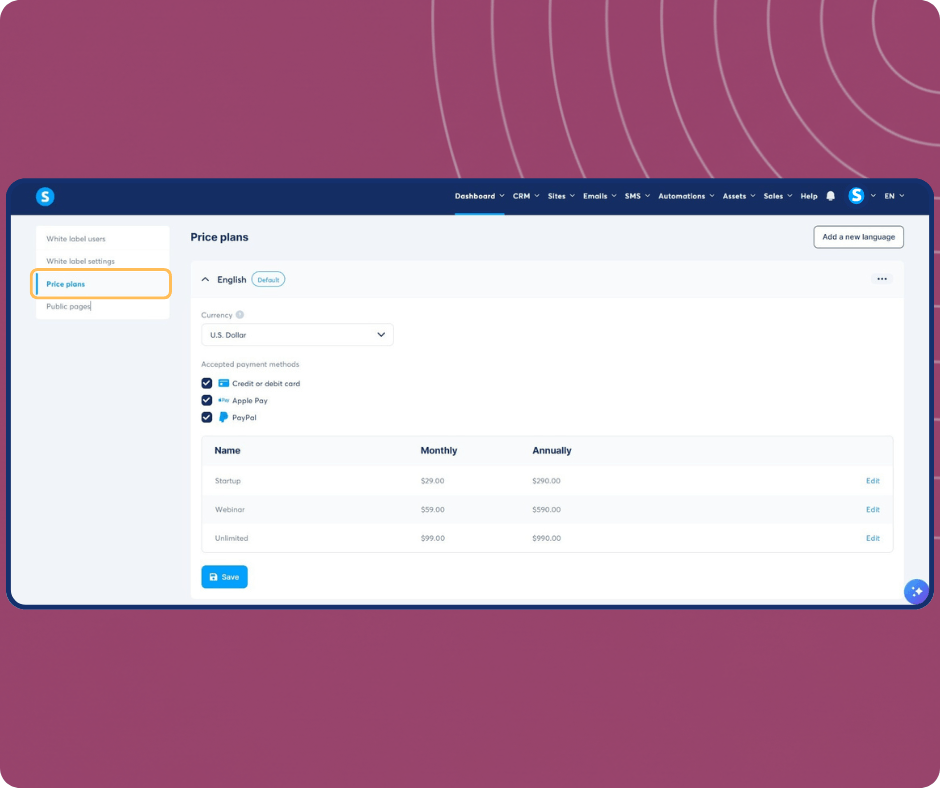 Set your own pricing by creating custom monthly and annual plans in multiple currencies