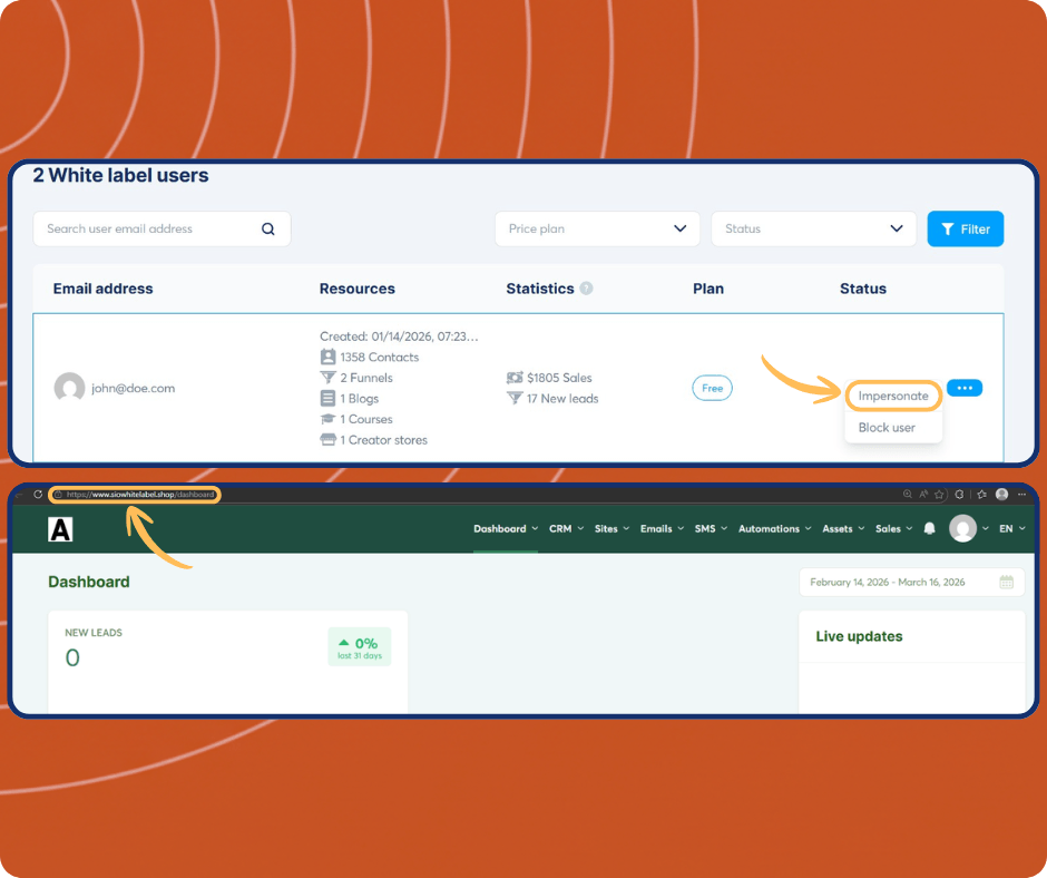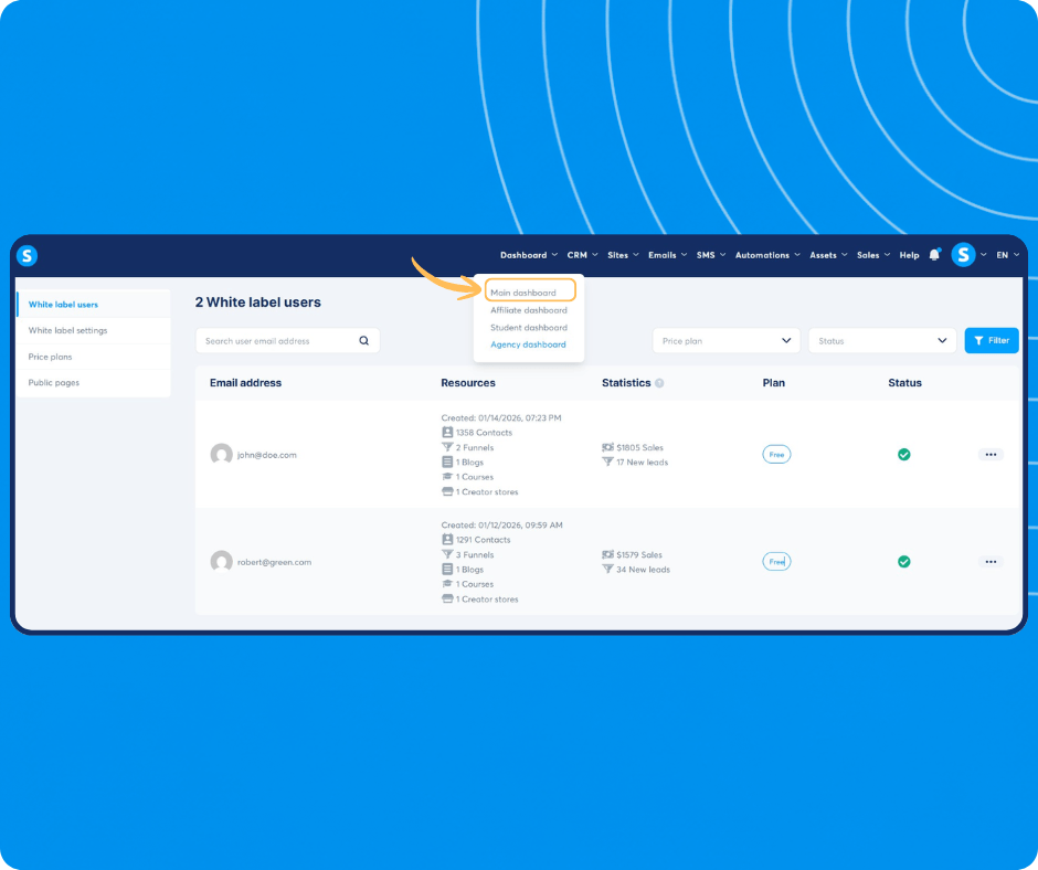 View all your white label users from the agency dashboard. Track key stats per account like active plans, revenue, and generated leads. You can easily search, filter, block users, or impersonate accounts to help clients with setup